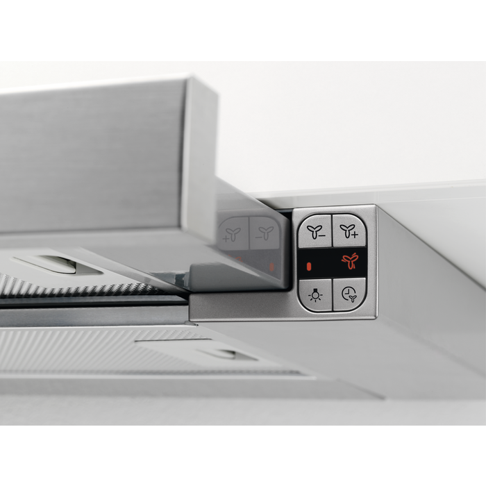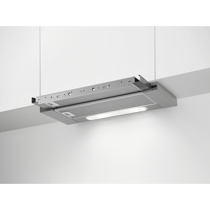 Дуже зручно, що витяжка може працювати в режимі витяжки або рециркуляції, якщо встановлений вугільний фільтр. Модель встановлюється у вигляді телескопічної витяжки шириною 60 см, що робить її ідеальною для компактних кухонь. Мінімальна відстань від плити до витяжки становить 43 см.