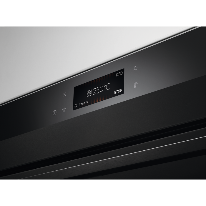 З об'ємом 71 літр, цей духовий шкаф має великий простір для приготування різноманітних страв. Інтуїтивно зрозумілий TFT Full Touch дисплей дозволяє легко вибирати режими приготування та контролювати процес. Керування температурою здійснюється в діапазоні від 30°C до 300°C, що робить його універсальним для приготування будь-яких страв.