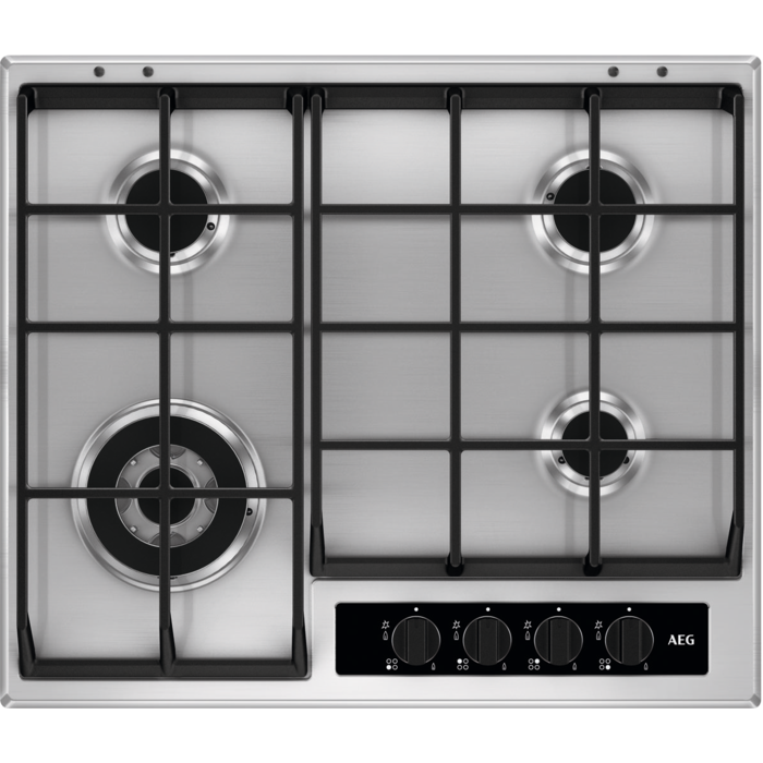 Варильна поверхня AEG HG565455SY виготовлена з нержавіючої сталі, що забезпечує надійність і довговічність. Вона працює на газі і має два тримачі посуду з чавуну, які забезпечують стабільність посуду під час приготування.