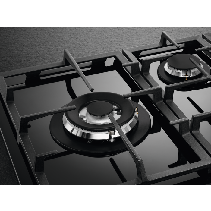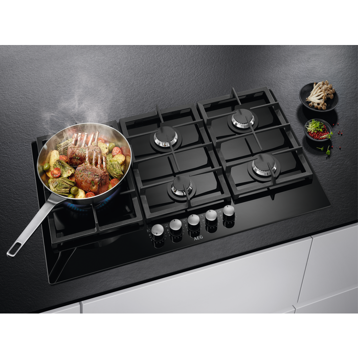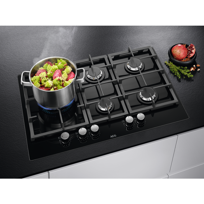 Газова варильна поверхня AEG HKB75820NB - це автономна варильна поверхня з верхніми регуляторами, яка поєднує в собі сучасний дизайн та передові технології. Вона розрахована на установку на стільницю та має широкий функціонал, що робить кулінарний процес простим та зручним. Технологія Gas auf Glas забезпечує безпеку та ефективність використання. Вона включає в себе швидкісний палювальний елемент, який працює на 20% швидше, ніж традиційні елементи, а також потужний триплекс-пальник, який забезпечує рівномірне нагрівання посуду. Ця варильна поверхня має 5 газових зон, включаючи одну зону для воку. Регулювання потужності в 9 рівнів дозволяє точно контролювати температуру під час приготування різних страв. Gas Progressive Safe - це додатковий захист, який забезпечує безпеку під час використання газу. Варильна поверхня оснащена грифами, які забезпечують надійний захоп та управління, а також термозахистом, який запобігає перегріванню. Дизайн варильної поверхні безрамковий, що додає сучасний вигляд та робить її легкою в очищенні. Вона має розміри 75 см в ширину та може бути встановлена на стільницю. Кабель має довжину 1,1 м, що забезпечує зручність при підключенні. AEG HKB75820NB - це інтелектуальна варильна поверхня, яка може бути підключена до мобільних додатків та отримувати оновлення для забезпечення максимальної продуктивності. Завдяки цим функціям вона стане невід'ємною частиною сучасної кухні.