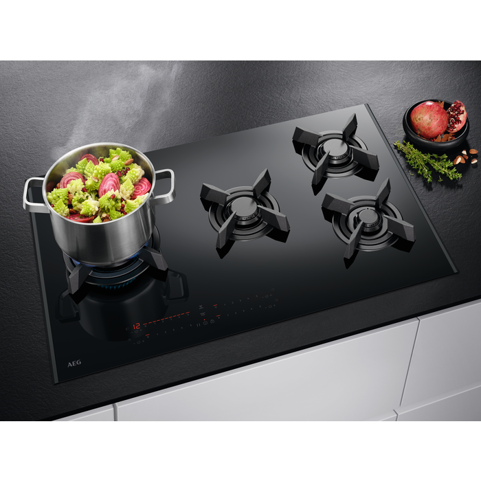 Варильна поверхня AEG HVB8453IB поєднує в собі керамічні та газові конфорки, що робить її універсальним і практичним пристроєм для кухонь різного типу. Завдяки Statement Frame, Aluminium рамці, ця варильна поверхня виглядає стильно та сучасно. Сенсорні кнопки знаходяться спереду, що робить керування пристроєм максимально зручним. Модель оснащена кількома конфорками, включаючи допоміжну конфорку та конфорку середньої швидкості, обидві з вертикальним полум'ям. Функція Stop and Go забезпечує можливість коротких перерв у готуванні, що є дуже зручною опцією. Також пристрій має функцію захисту від доступу дітей, що робить його безпечним для використання в сім'ях з маленькими дітьми. Щодо безпеки, варильна поверхня оснащена автоматичним вимиканням, дитячим замком та термопарою. Індикатор залишкового тепла дозволяє вам завжди бути в курсі стану конфорок. Легка встановлення завдяки системі фіксаторів робить процес установки швидким і простим. В комплекті йде набір для переведення на інший тип газу, що робить цю варильну поверхню універсальною для будь-яких умов. Завдяки своїм розмірам (ширина 800 мм, глибина 520 мм) вона підійде для більшості кухонь. Ця варильна поверхня виготовлена в Італії, відповідає всім європейським стандартам та нормам безпеки, що робить її надійним та безпечним вибором для кожної кухні.