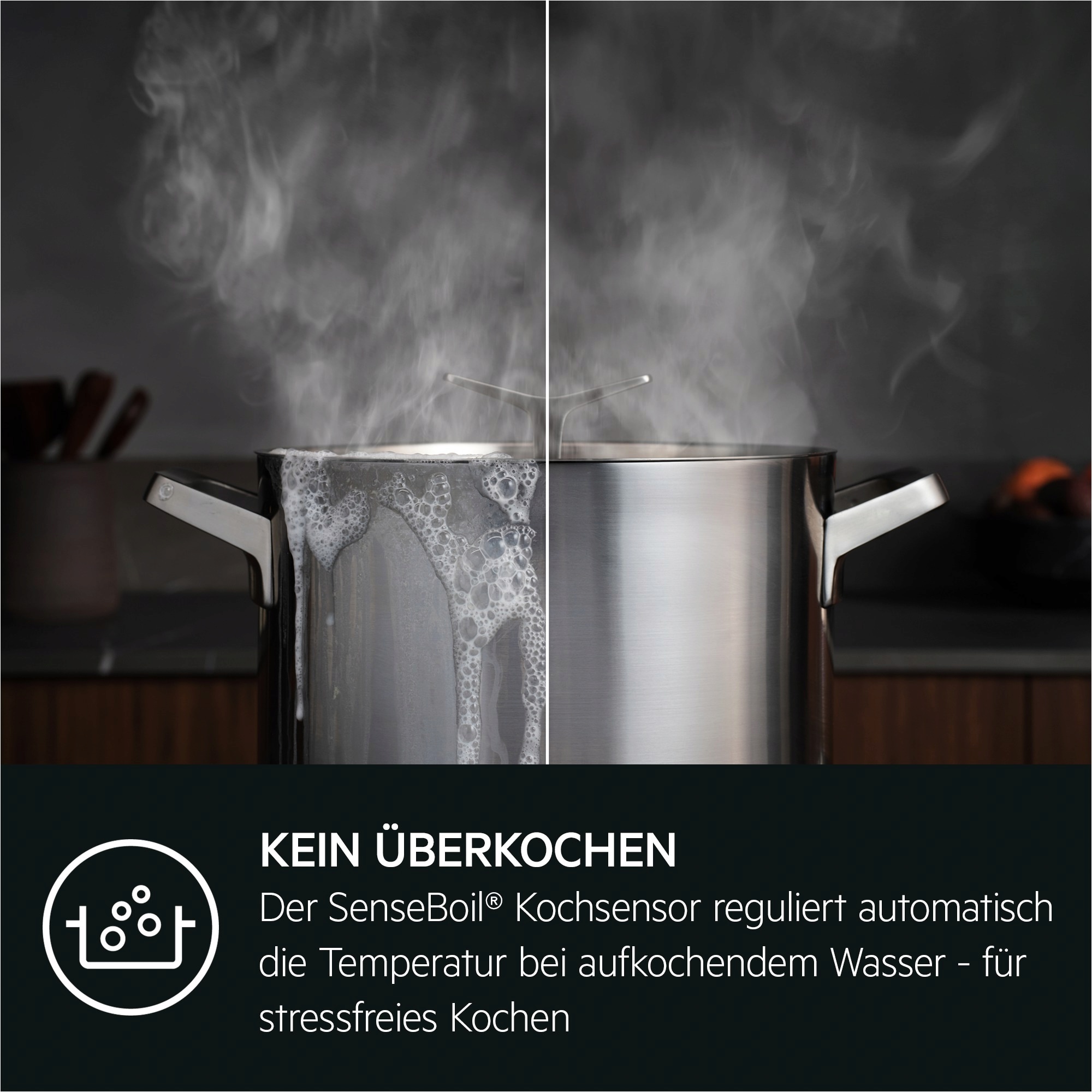Ця варильна поверхня оснащена SenseBoil® Sensor, який автоматично регулює температуру для швидкого закипання води. 4 індукційні комфорки мають 14 ступенів регулювання, а також функцію Power-Funktion для кожної зони, що дозволяє швидко нагрівати посуд.
