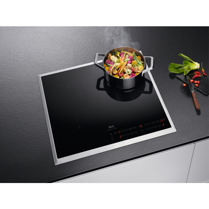 Індукційна варильна поверхня AEG IKB64431XB пропонує найсучасніші технології для комфортного та ефективного приготування страв. Завдяки Direct-Control Kochzonen-Ansteuerung ви з легкістю регулюєте потужність кожної з 4 індукційних кухонних зон. Функція Power-Funktion надає можливість швидко нагріти посуд. OptiFit Frame - нержавіюча сталь, витончений дизайн, вишуканий лазерний гравіювальний логотип, що робить цю варильну поверхню елегантною та функціональною. Функція Hob²Hood забезпечує автоматичне включення витяжки при використанні варильної панелі. Крім цього, пристрій оснащений Pause-Funktion, CountUp-Timer, OffSound Control і функцією Kindersicherung, що надає додатковий рівень безпеки використання. ÖKO-Timer дозволяє заощаджувати електроенергію, використовуючи залишкове тепло для приготування страв. Завдяки технології OptiHeat Control ви завжди будете в курсі того, яка кухонна зона є ще гарячою. Також варильна поверхня має функцію Leistungsabhängige Abschaltautomatik, що автоматично вимикає кухонну зону після закінчення приготування. Крім цього, варильна поверхня має SlimFit-Design, яке забезпечує невелику глибину, що полегшує процес встановлення. Даний пристрій є автономним, має чорне скло, а також зручне керування за допомогою Slider Touch. Він підтримує підключення до додатків і отримує гарантовані оновлення протягом принаймні 24 місяців. Завдяки своїм технологічним можливостям, варильна поверхня AEG IKB64431XB стане невід’ємною частиною вашої кухні, забезпечуючи швидке та якісне приготування їжі.