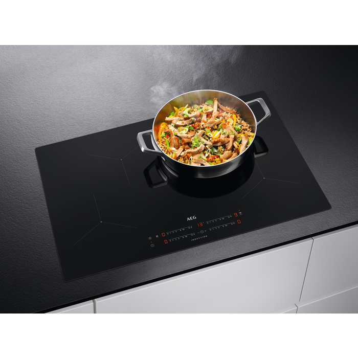 Варильна поверхня AEG IKB84431IB - це високотехнологічний кухонний прилад, виготовлений в Німеччині, який пропонує безліч функцій для забезпечення комфортного та ефективного приготування їжі. Завдяки індукційній технології ця варильна поверхня забезпечує швидке та рівномірне нагрівання посуду, що дозволяє економити час та енергію. Управління кухонним приладом здійснюється за допомогою Slider Touch, що додає зручності та сучасного вигляду. Поверхня є автономною та має чотири індукційні зони, кожна з яких має можливість регулювання на 14 рівнів, що дозволяє точно налаштувати температуру для кожної зони. Особливо варто відзначити функцію Power-Funktion, яка забезпечує швидке нагрівання кухонної зони до максимальної потужності, а також Pause-Funktion, що дозволяє тимчасово зупиняти процес готування. Для безпеки користування є функція Kindersicherung, яка унеможливлює випадкове ввімкнення плити. Також, варильна поверхня оснащена OptiHeat Control, що надає трьохрівневий індикатор залишкового тепла, а також Leistungsabhängige Abschaltautomatik, яка автоматично вимикає плиту за певних умов для забезпечення безпеки. Дизайн варильної поверхні вражає своєю елегантністю та мінімалістичним підходом, а також слім-дизайн забезпечує гранично знижену товщину, що полегшує процес встановлення. Всі ці характеристики роблять варильну поверхню AEG IKB84431IB незамінним помічником на кухні, який забезпечить комфорт та безпеку під час приготування їжі.