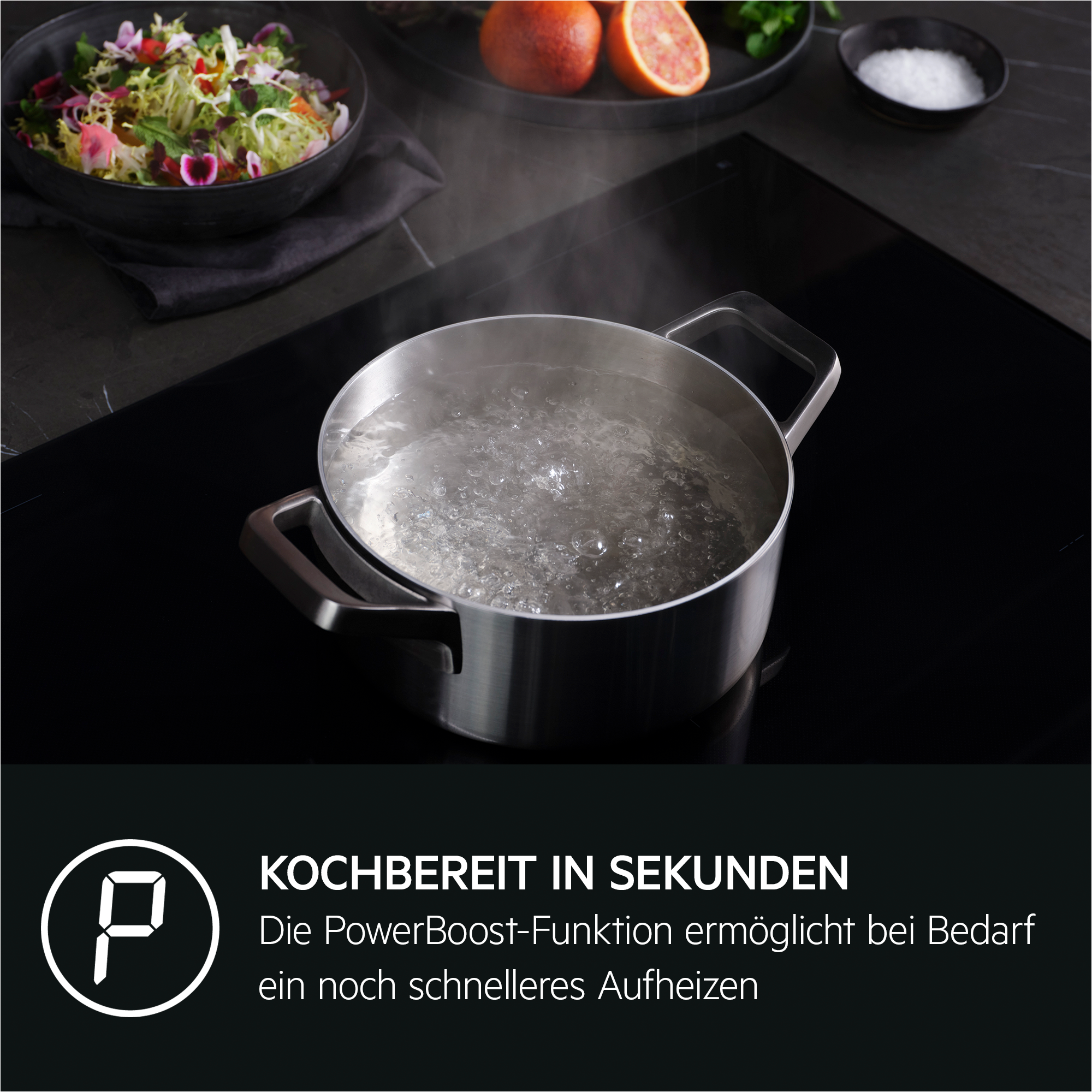 Також важливою характеристикою є SlimFit-дизайн, який забезпечує невелику глибину вбудовування і позбавляє необхідності встановлення захисного дна. Крім того, варильна поверхня має чорне скло та високу потужність кожної зони нагріву.