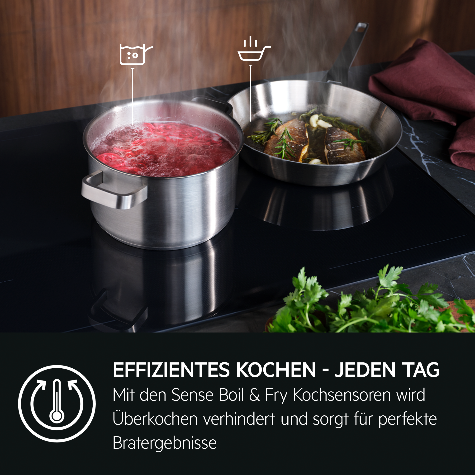 Розширені можливості: енергоефективний пристрій EcoLine, виробництво в Німеччині, автономна плита з верхнім розташуванням елементів керування, функція SenseBoil® для виявлення бульбашок та автоматичного зменшення потужності, 4 індукційні зони нагріву з регулюванням потужності на 9 рівнях.