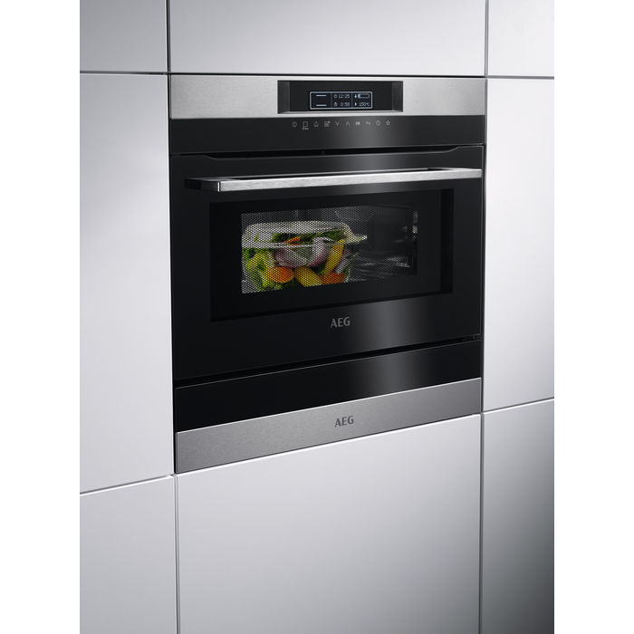 AEG KMK721000M обладнаний чотирма скловими дверцятами, які значно знижують температуру зовнішньої поверхні, забезпечуючи безпечне використання. Вентилятор охолодження автоматично запускається для охорони електронних компонентів, що підвищує надійність пристрою. Загальна споживана потужність становить 2000 Вт, що теж свідчить про його ефективність. Духовий шкаф підтримує температурний діапазон від 30°C до 230°C, що дає можливість експериментувати з різними рецептами.