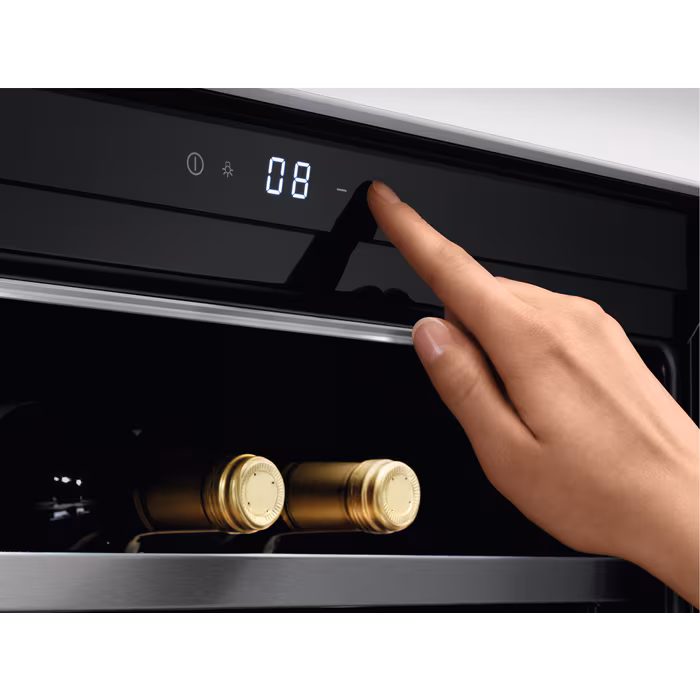 Ознайомтесь з інноваційним холодильником AEG KWK884520M, ідеальним рішенням для зберігання вашого вина. Цей вбудований винний холодильник забезпечує **комфортну електронну регуляцію температури** з цифровою індикацією, що дозволяє підтримувати оптимальний температурний режим від **+5°C до +20°C** для зберігання до **18 пляшок стандартного розміру** (0,75 л).