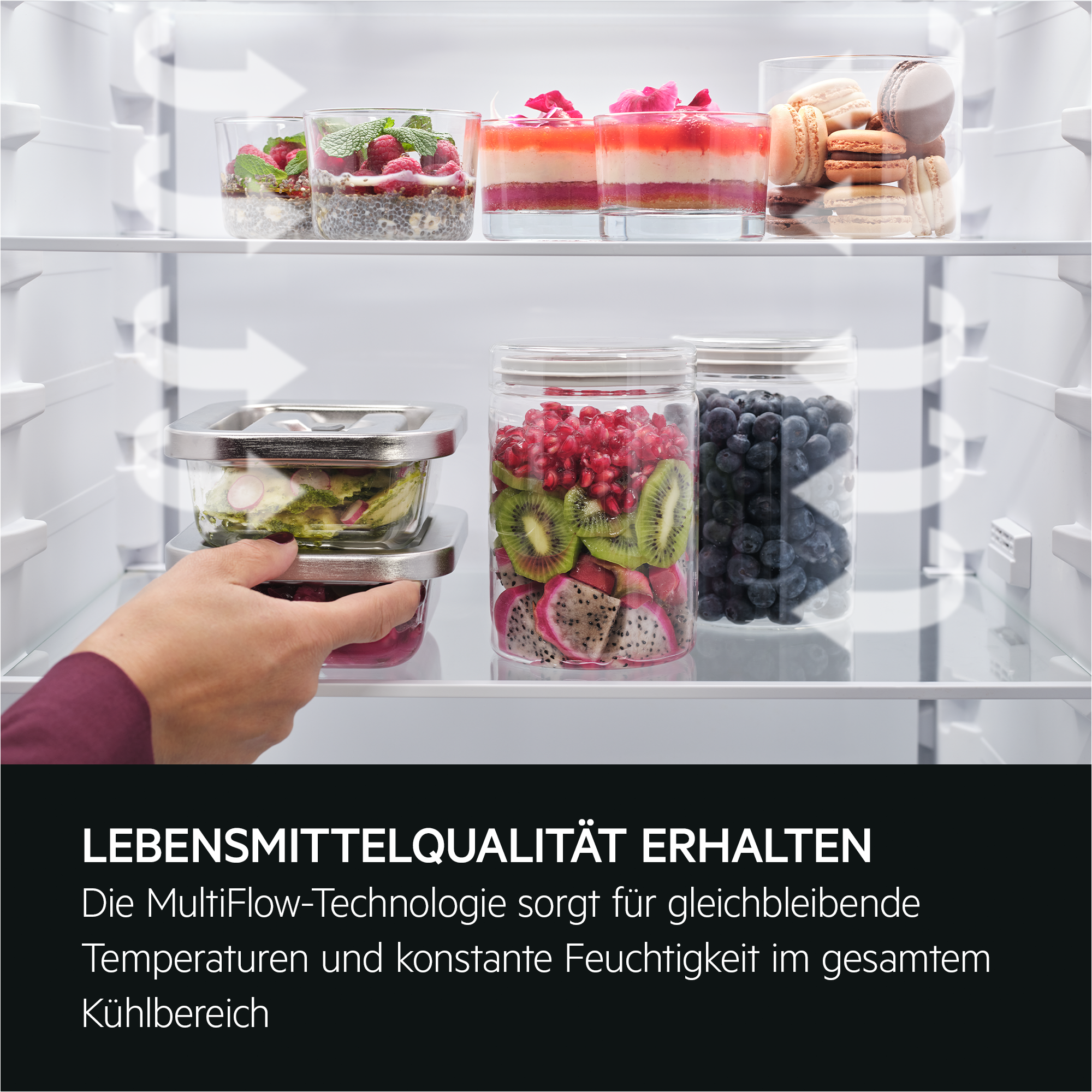 Завдяки TwinTech®-Technologie забезпечується оптимальна циркуляція повітря між холодильною і морозильною камерами, що дозволяє підтримувати ідеальну вологість для зберігання продуктів. Спеціальна система CustomFlex® дає змогу вільно настроювати внутрішній простір холодильника, що дозволяє зручно розмістити великогабаритні продукти.