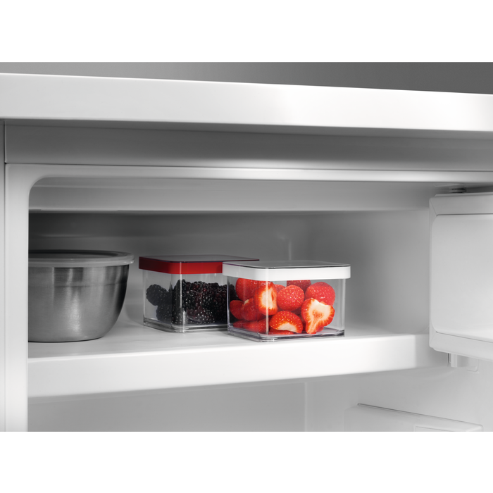 У конструкції передбачені висувні ящики для фруктів та овочів, а також місце для яєць (на 6 яєць). Холодильник має змінний напрямок відкриття дверей та регульовані ніжки, що забезпечує зручність установки. З рівнем шуму лише 38 дБ(A), він працює майже непомітно.