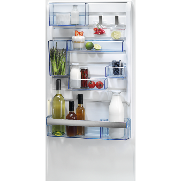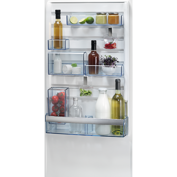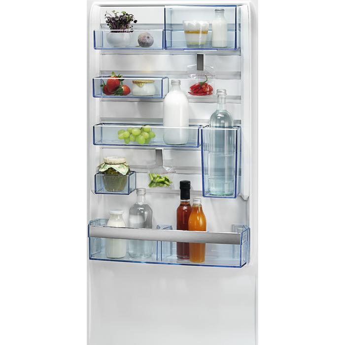 На внутрішніх полицях, які виконані зі скла з окантуванням, комфортно розташовуються продукти, а в морозильнику пропонуються прозорі шухляди, що дозволяють швидко знаходити необхідні продукти. Холодильник також оснащений світлодіодним освітленням, що забезпечує відмінну видимість всередині.