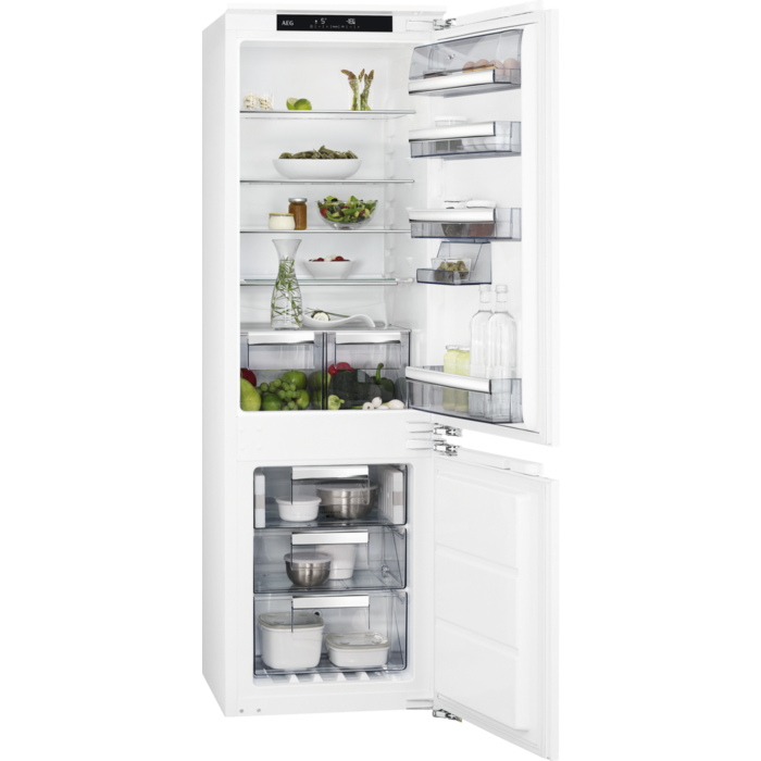 У конструкції AEG SCR81816NC використовуються скляні полиці, що є як естетично привабливими, так і практичними — вони легко чистяться та забезпечують надійність. Холодильник надає такі переваги, як світлодіодне освітлення, що підсвічує вміст, а також достатній простір із прозорими шухлядами для зручного доступу до продуктів. У загальному, AEG SCR81816NC — це поєднання елегантності, технологічності та зручності в щоденному використанні.