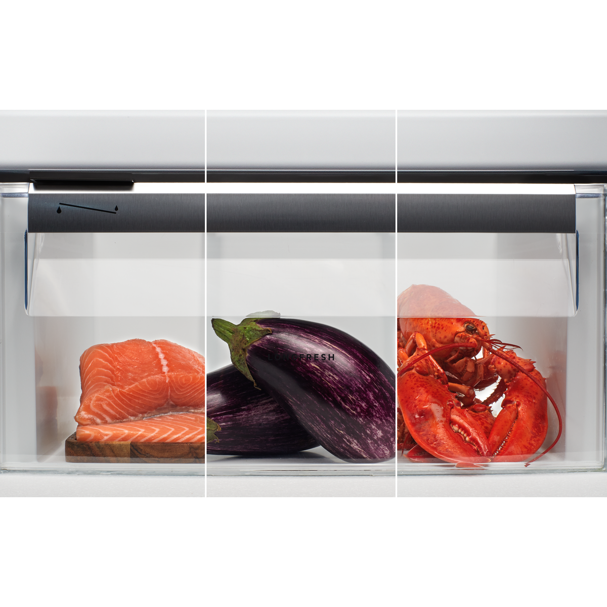 У внутрішньому просторі розташовані 3 повноширокі полиці та одна Flexi, виготовлені у стильному металевому сірому кольорі. Холодильник оснащений LED-підсвіткою, що не тільки економить енергію, але й надає естетичний вигляд всередині.