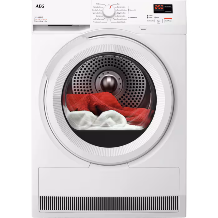 AEG TR7C40699 має **інтелектуальну систему управління ProSense®**, яка адаптує час сушіння залежно від вологості білизни, заощаджуючи енергію та запобігаючи пошкодженню тканин. Ви також оціните **LED-дисплей** з функцією **вибору часу старту** та **індикацією залишкового часу**, що спрощує управління процесом сушіння.