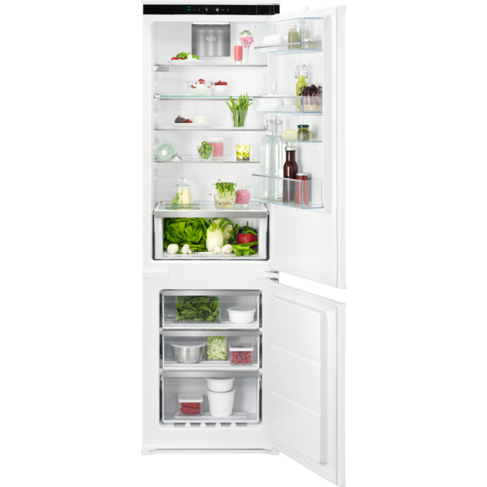 Холодильник AEG TSC7G181DS - це сучасний прилад, який поєднує в собі найновіші технології для збереження продуктів. Його основна перевага - це NoFrost-Technik у морозильній камері, що позбавляє користувачів від необхідності частого розморожування. Завдяки TwinTech®-Technologie забезпечується окрема циркуляція повітря між холодильним та морозильним відділеннями, що сприяє довшому зберіганню свіжості продуктів.