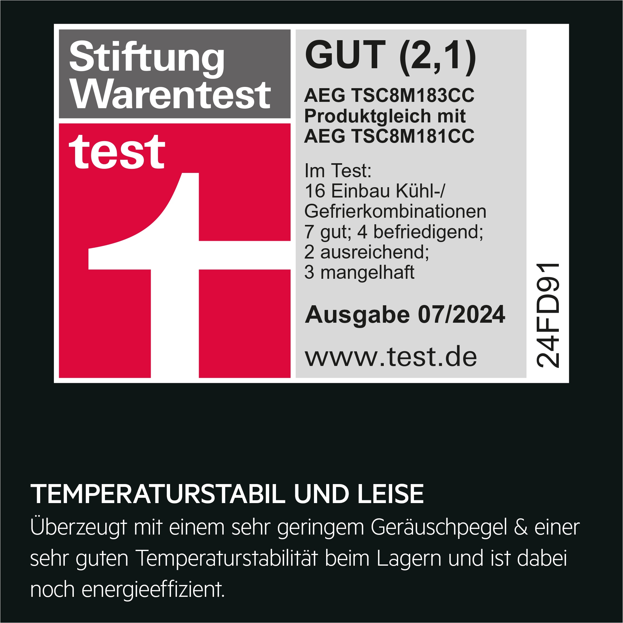 Потужність і ефективність AEG TSC8M183CC підкреслюється енергетичним класом C, а також сукупним корисним об'ємом у 245 літрів, де 182 літри відведено під холодильну камеру та 62,4 літри - під морозильну.