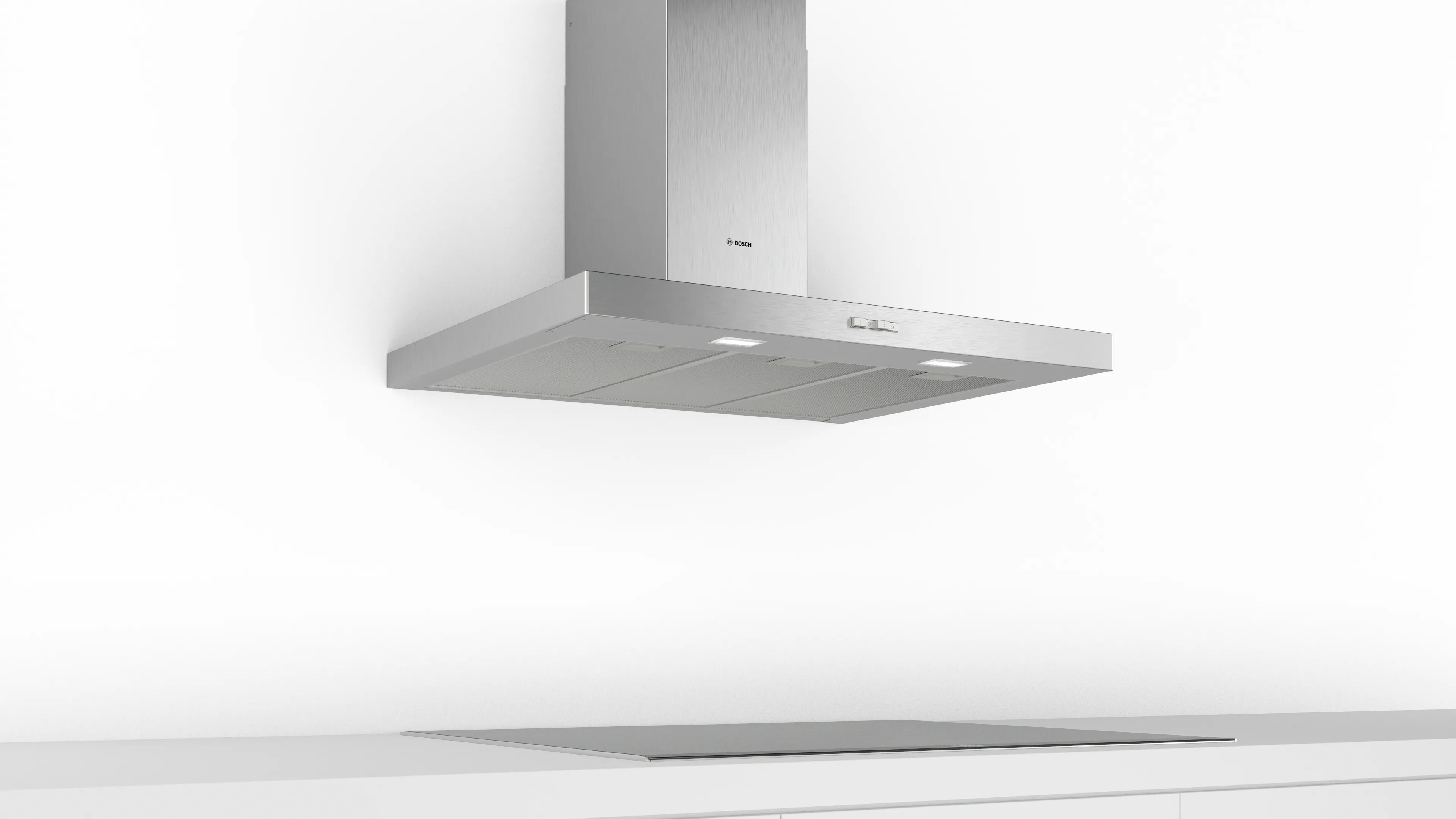 Духова витяжка Bosch DWB96BC50 - ідеальний вибір для сучасної кухні. Її ширина в 90 см і стильний нержавіючий метал додають елегантності до інтер’єру. Ця витяжка призначена для стінного монтажу і має високу продуктивність.
