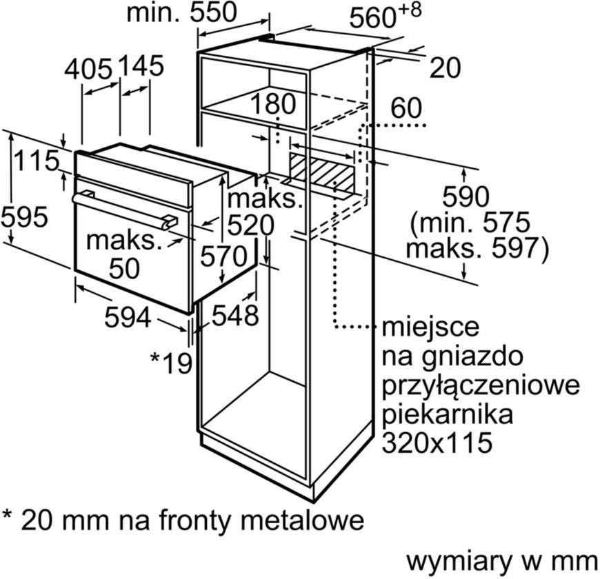 Розміри духовки становлять 59,5 х 59,4 х 54,8 см, що робить її ідеальною для вбудовування в кухонні меблі. Корпус виконаний з нержавіючої сталі, що не тільки підвищує естетичність, але й забезпечує довговічність матеріалу.