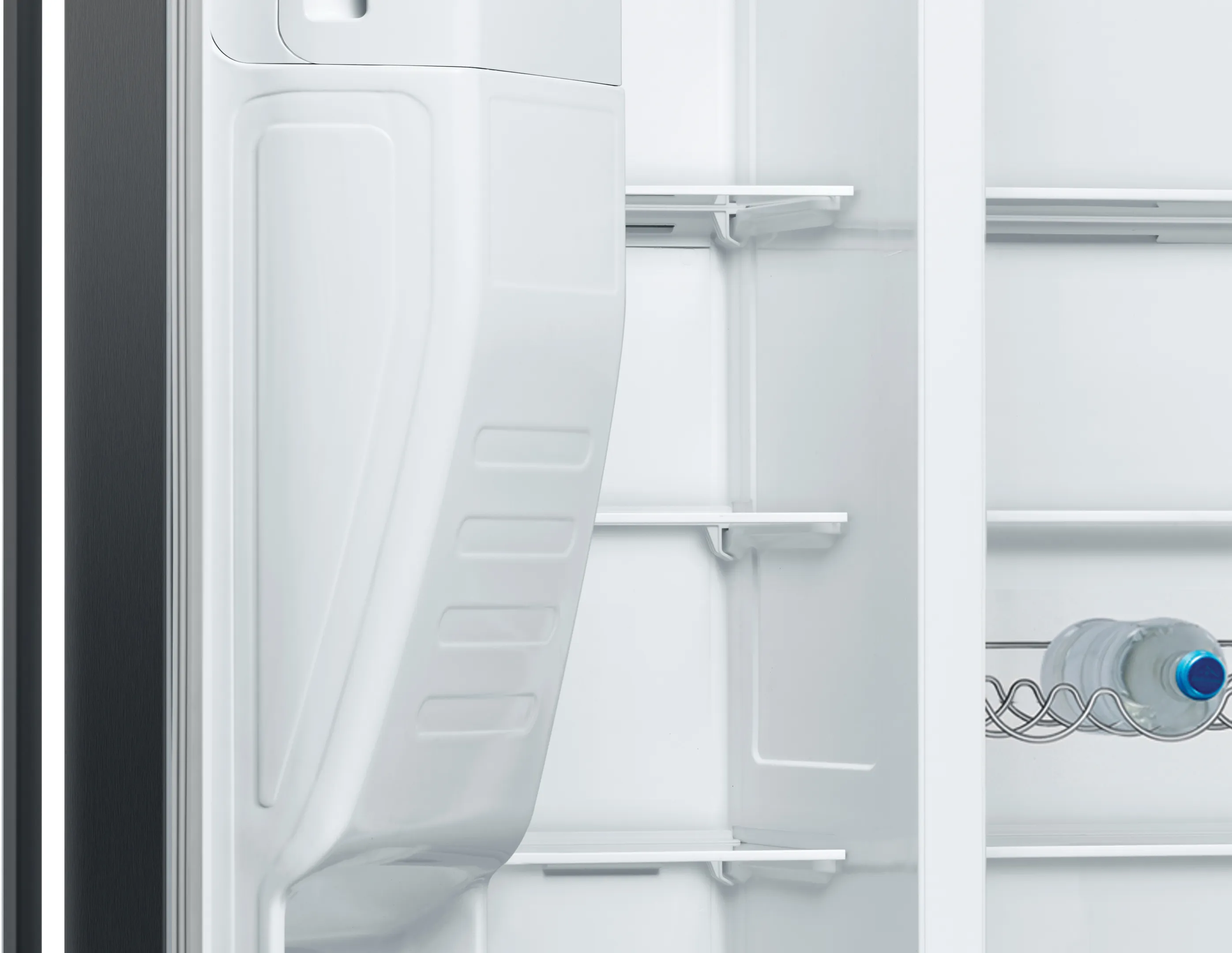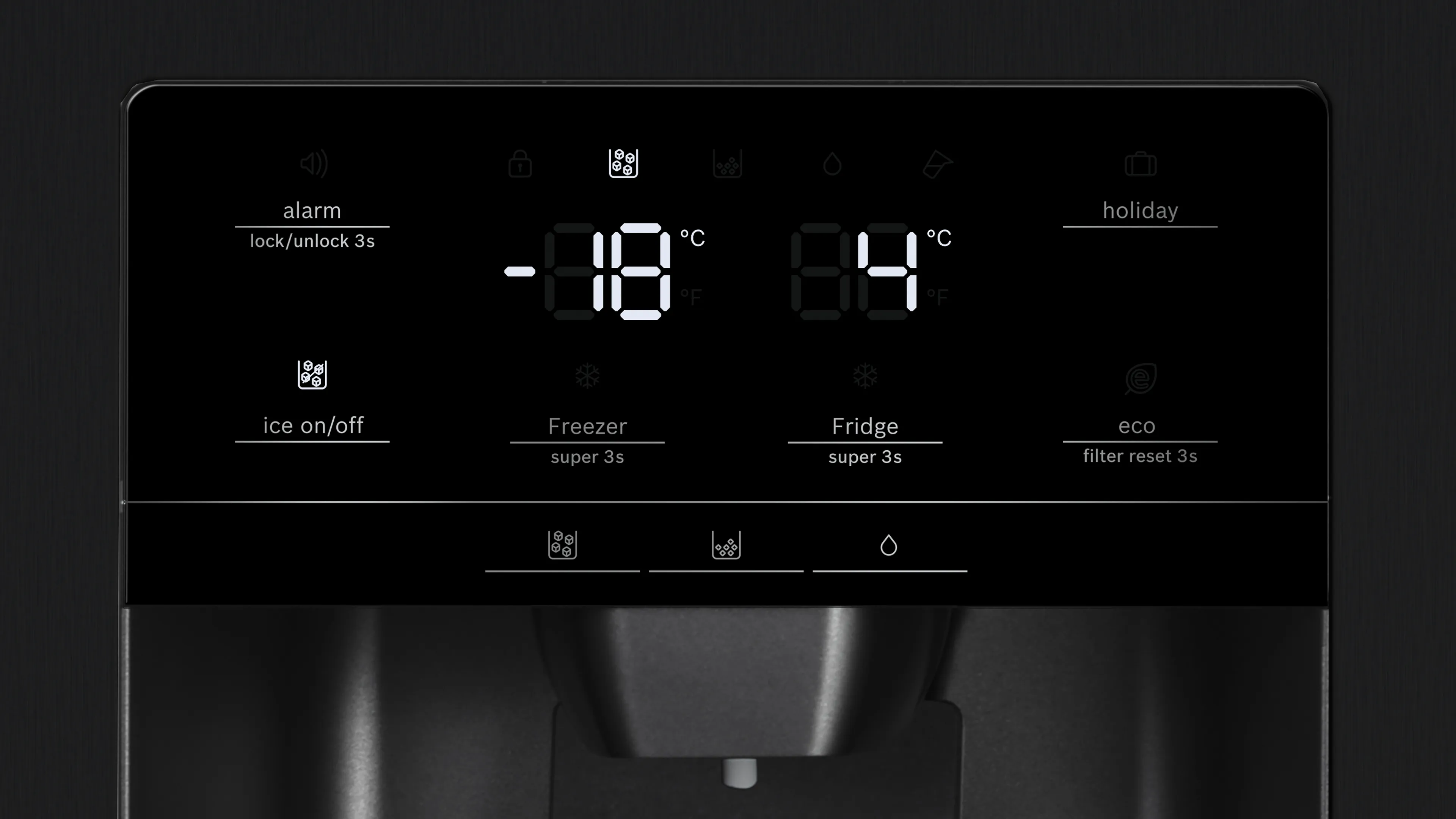 Зовнішні кнопки управління, такі як супершалтери для заморожування та охолодження, зручні для швидкої зміни температури. Окрім цього, холодильник оснащений функцією вода і льодогенератора, дозволяючи вам насолоджуватися охолодженими напоями будь-коли.