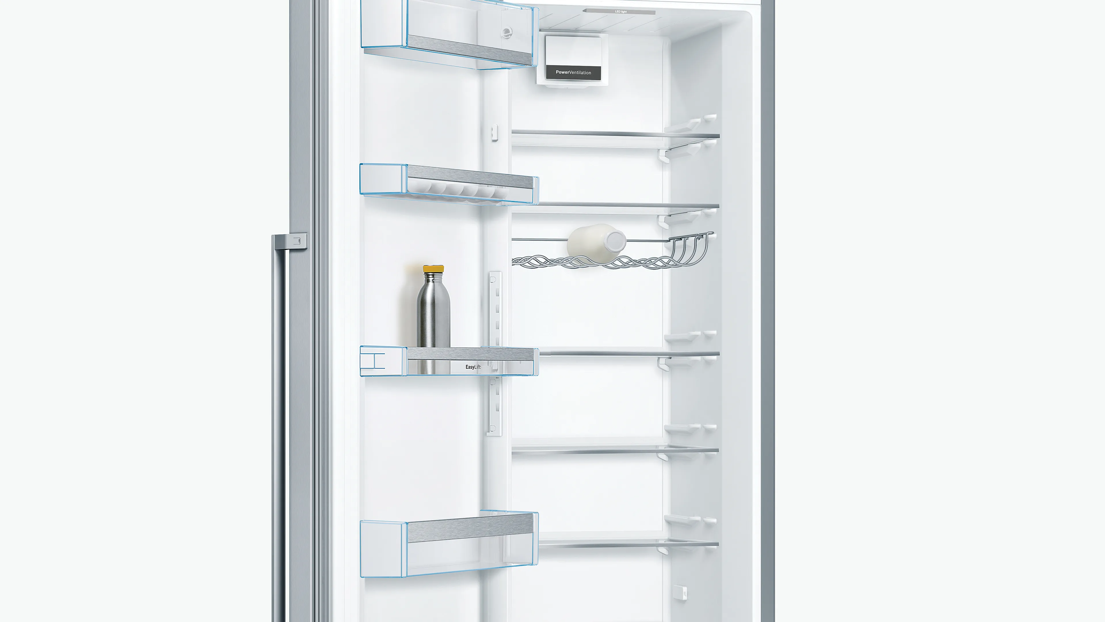 Холодильник Bosch KAN95AIEP - це ідеальне поєднання стилю і функціональності. Його сучасний дизайн з нержавіючої сталі AntiFingerprint не тільки прекрасно виглядає, але й легко очищується від відбитків пальців.