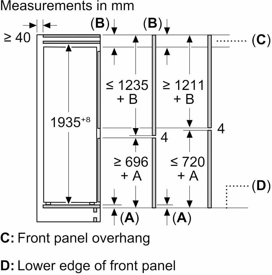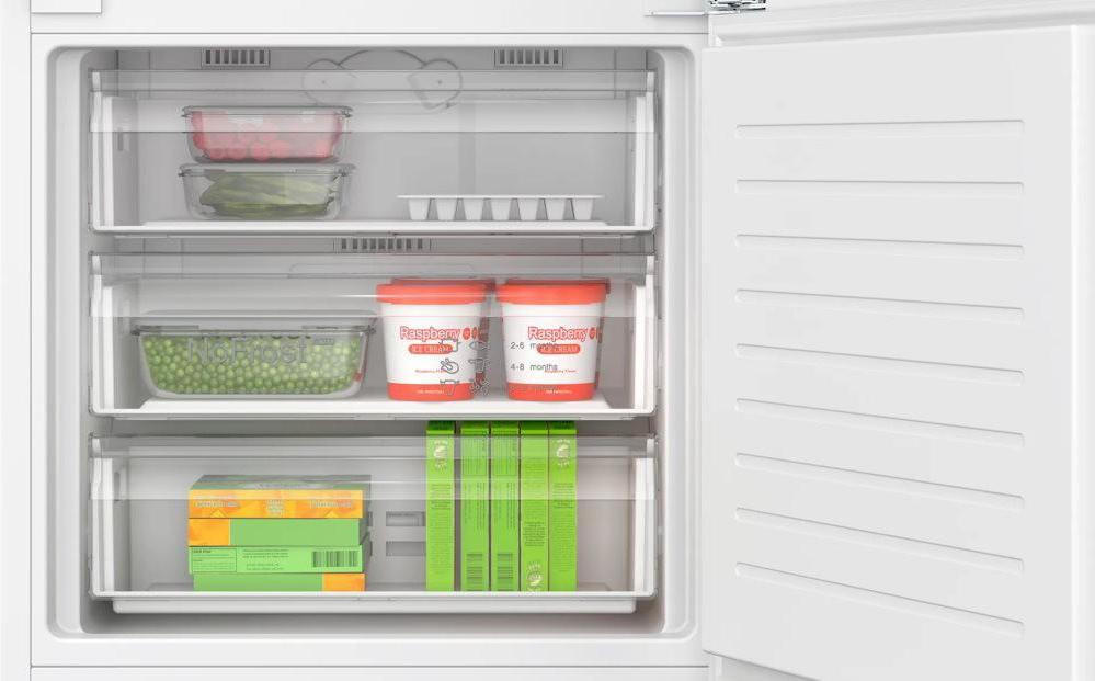 Холодильник Bosch KBN96VFE0 — це вбудована модель з морозильною камерою, що характеризується елегантним дизайном і високою функціональністю. Його загальна місткість становить 383 літри, з яких 285 літрів відведено під холодильне відділення, а 98 літрів — під морозильне. Завдяки технології No Frost в обох камерах, власник може забути про проблеми з інеєм та необхідність ручного розморожування.