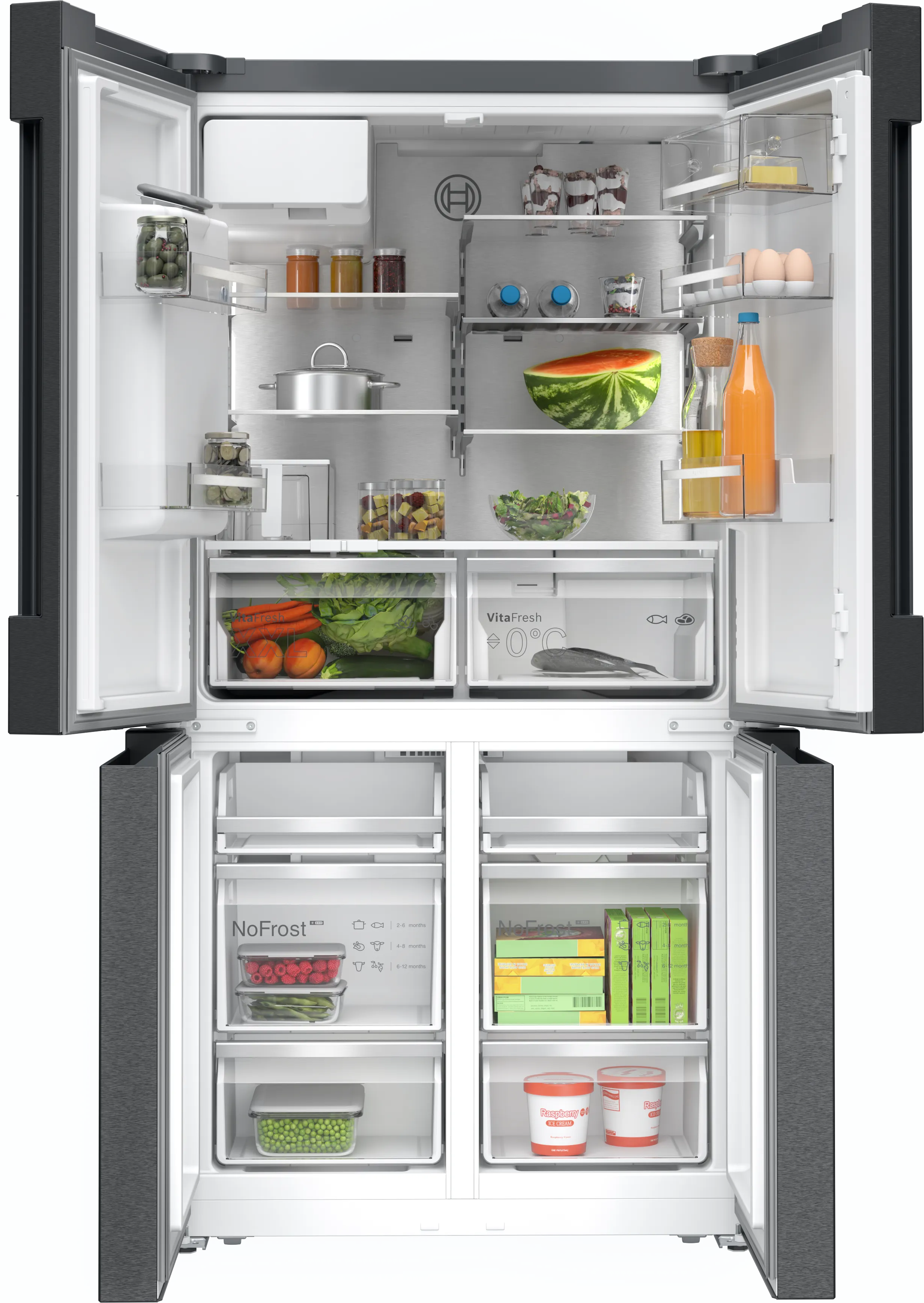 Об’єм холодильного відділу становить 375 л, що дозволяє розмістити велику кількість продуктів, а морозильна камера з об’ємом 199 л стане в нагоді для тривалого зберігання їжі. Холодильник Bosch KFI96AXEA оснащений технологією Total No Frost, що запобігає утворенню льоду та полегшує обслуговування. Це означає, що не потрібно проводити розморожування, а також забезпечується підтримка стабільного рівня вологості.