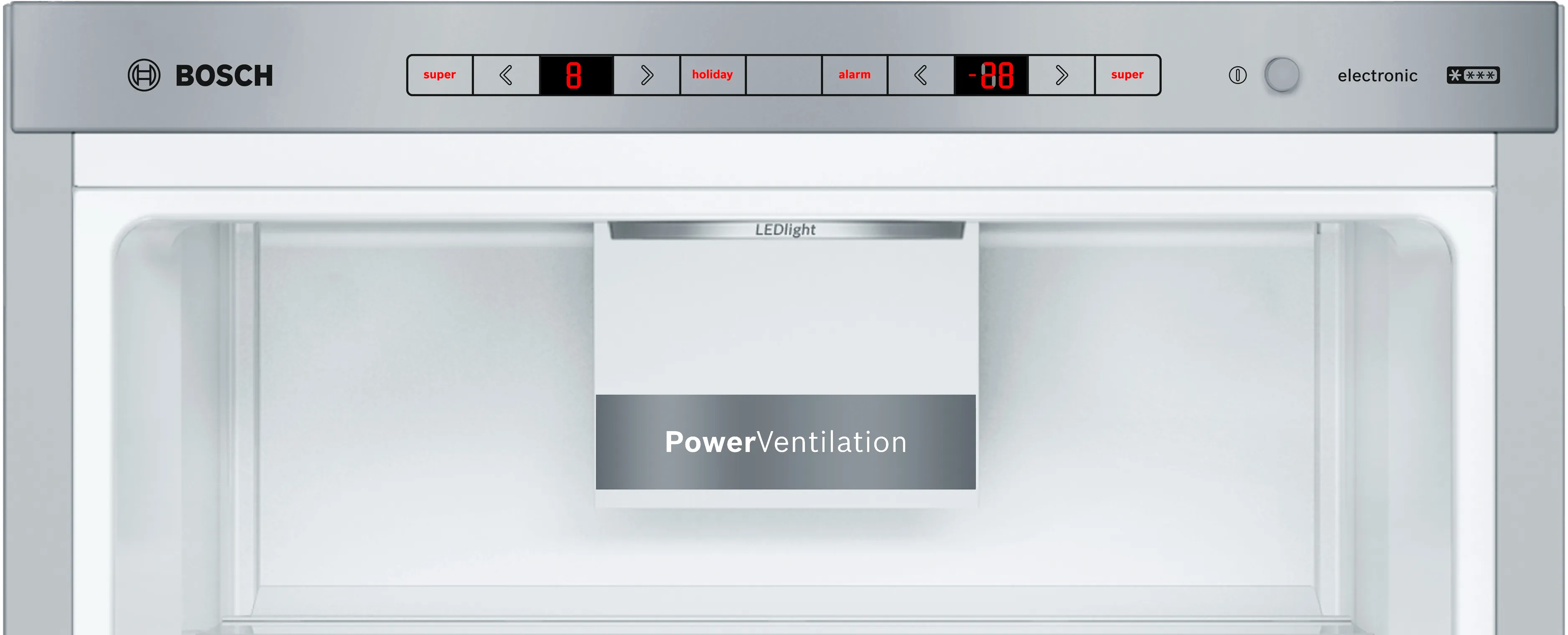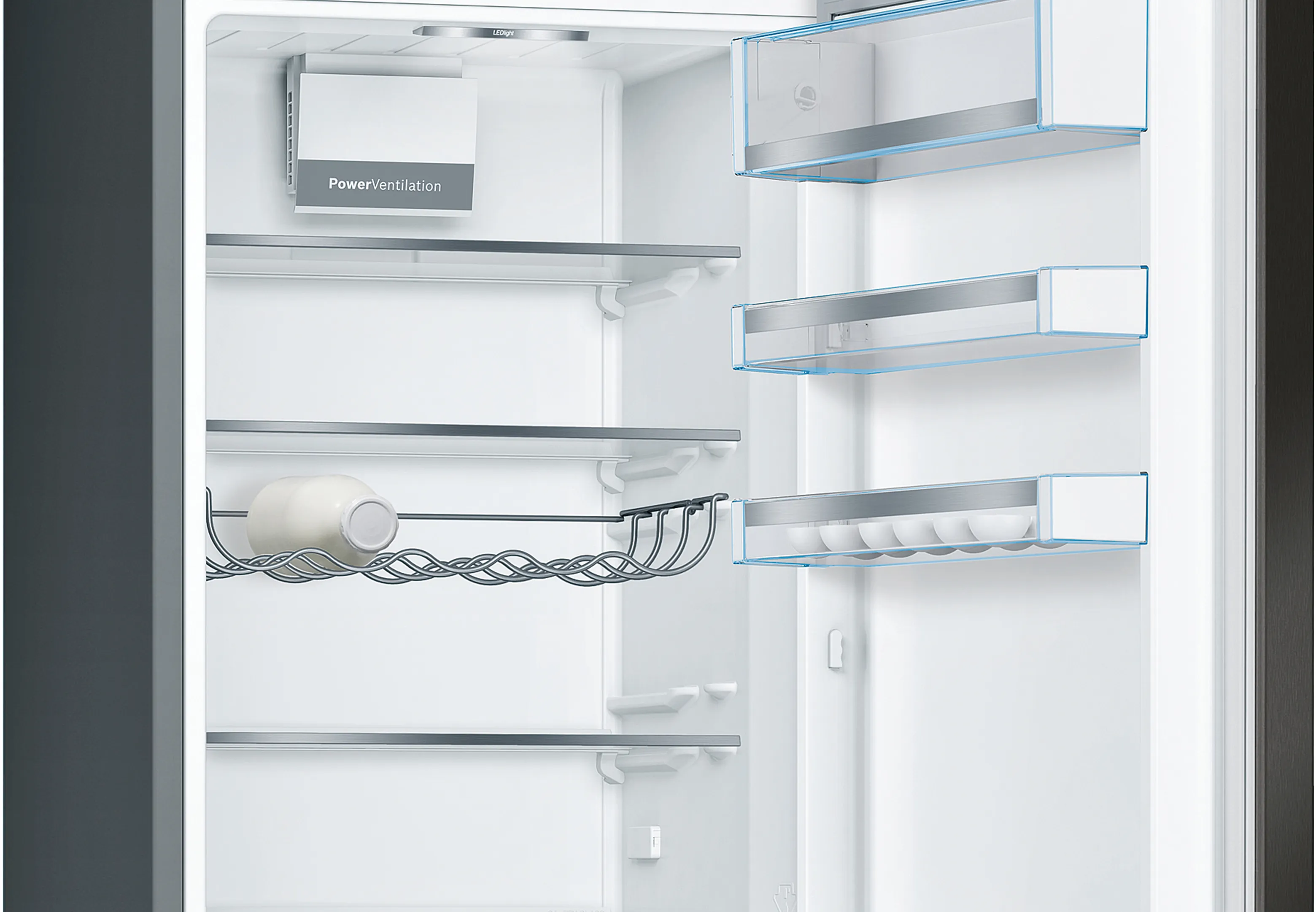 Холодильник має інтегровані елементи управління для зручності використання, включаючи індикатори температури для холодильного та морозильного відділів, а також звукові сигнали для попередження про відкриті двері або можливі неполадки. З Bosch KGE398XBA ви отримуєте не тільки якість, а й зручність у щоденному використанні.
