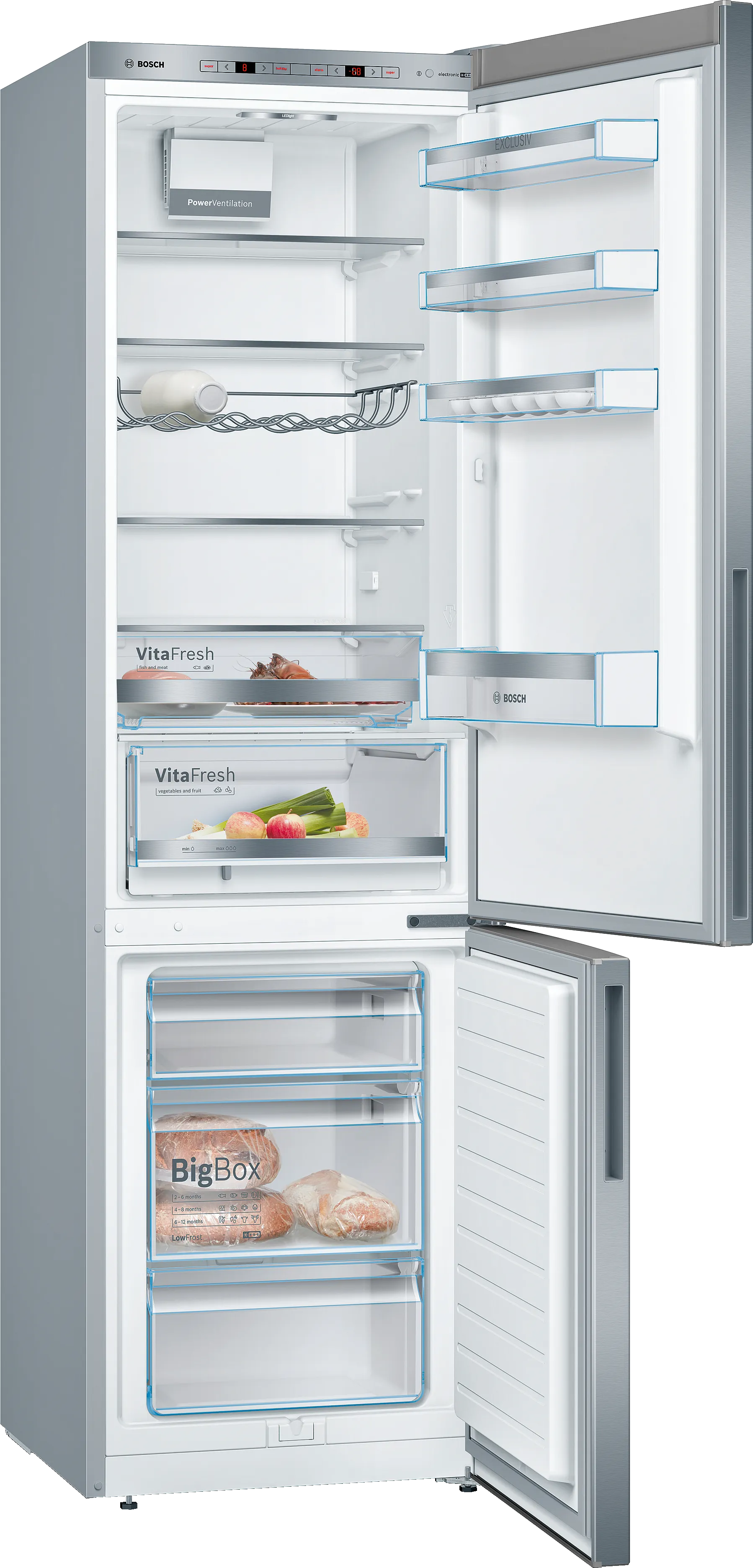 Холодильник має просторий об'єм охолоджувальної камери – 249 л та об'єм морозильної камери – 94 л, що дозволяє зберігати велику кількість продуктів. Особливою перевагою є система VitaFresh Plus, яка підтримує оптимальні умови для зберігання свіжих продуктів, а також VitaFresh Big Box для об'ємних заморожених товарів. Завдяки тихому режиму роботи з шумом лише 38 дБ(A), цей холодильник не буде заважати вам навіть у найтихіші миті.