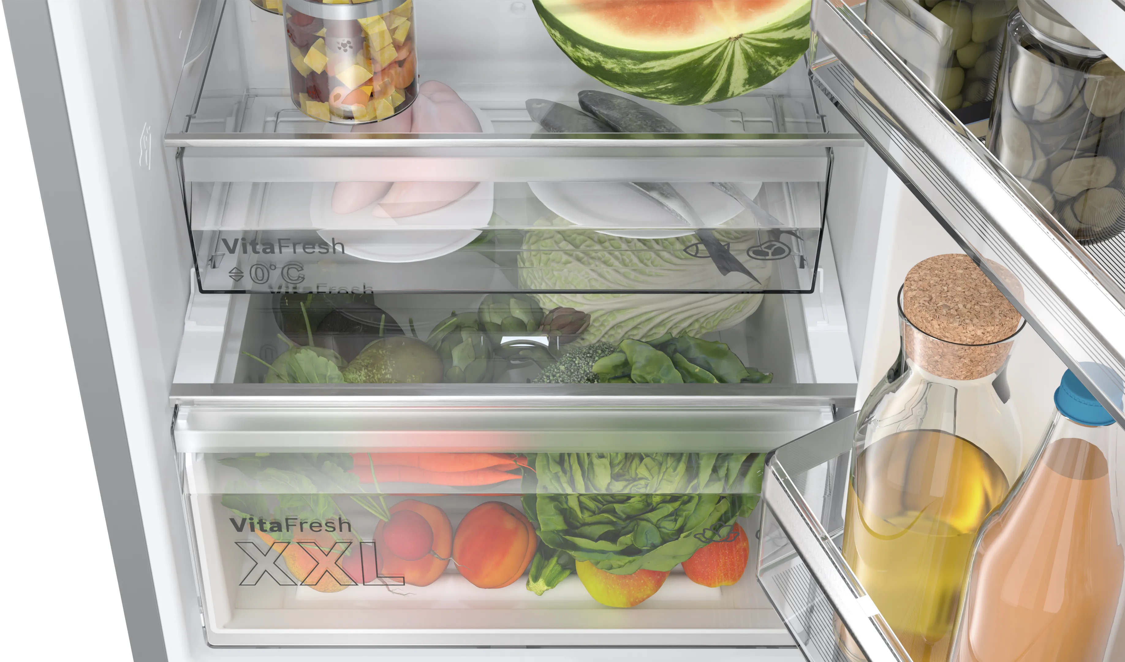 Холодильник Bosch KGN36EICF також оснащений інноваційною системою VitaFresh Plus, яка допомагає зберігати свіжість продуктів довше. Завдяки функції супершвидкого заморожування ви зможете швидко заморожувати продукти, зберігаючи їхні корисні властивості. Наприклад, він має індикатори температури для морозильного й охолоджуваного відділів, а також сигналізацію про відкриті дверцята.