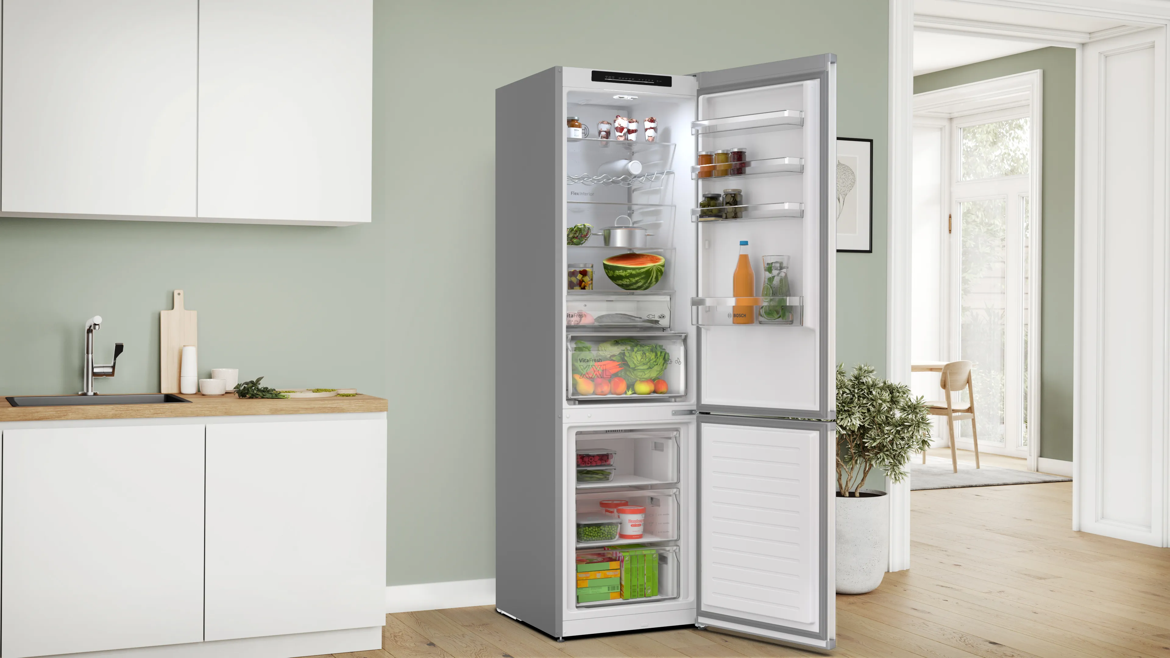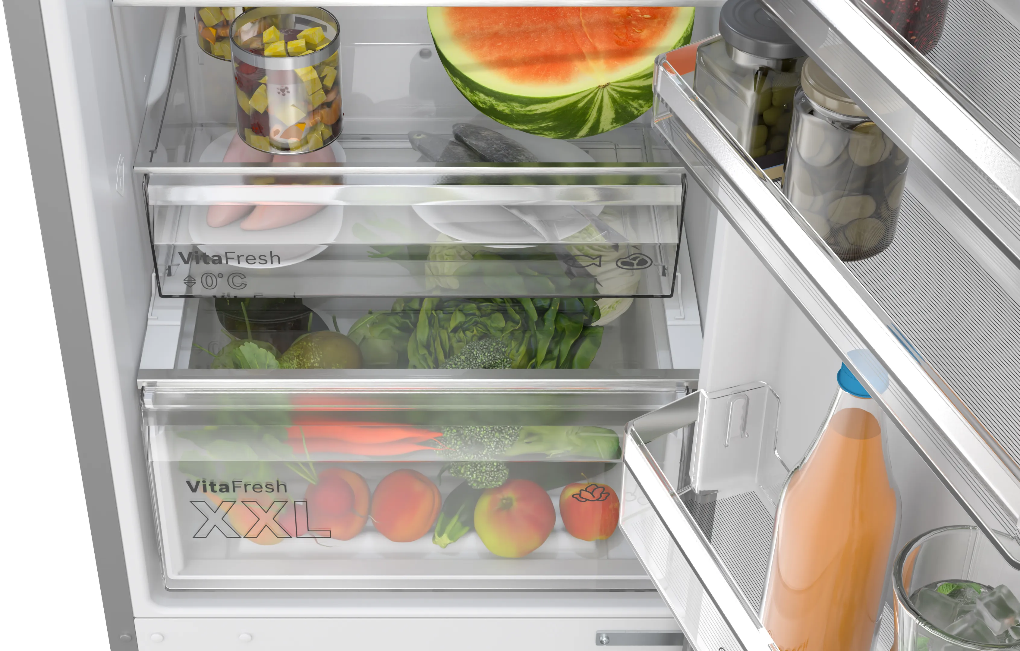 Значною особливістю є низький рівень шуму – всього 29 дБ(A), що робить його практично безшумним у використанні. У холодильнику Bosch також є система VitaFresh, яка підтримує свіжість продуктів протягом тривалого часу, зберігаючи їх поживні властивості.