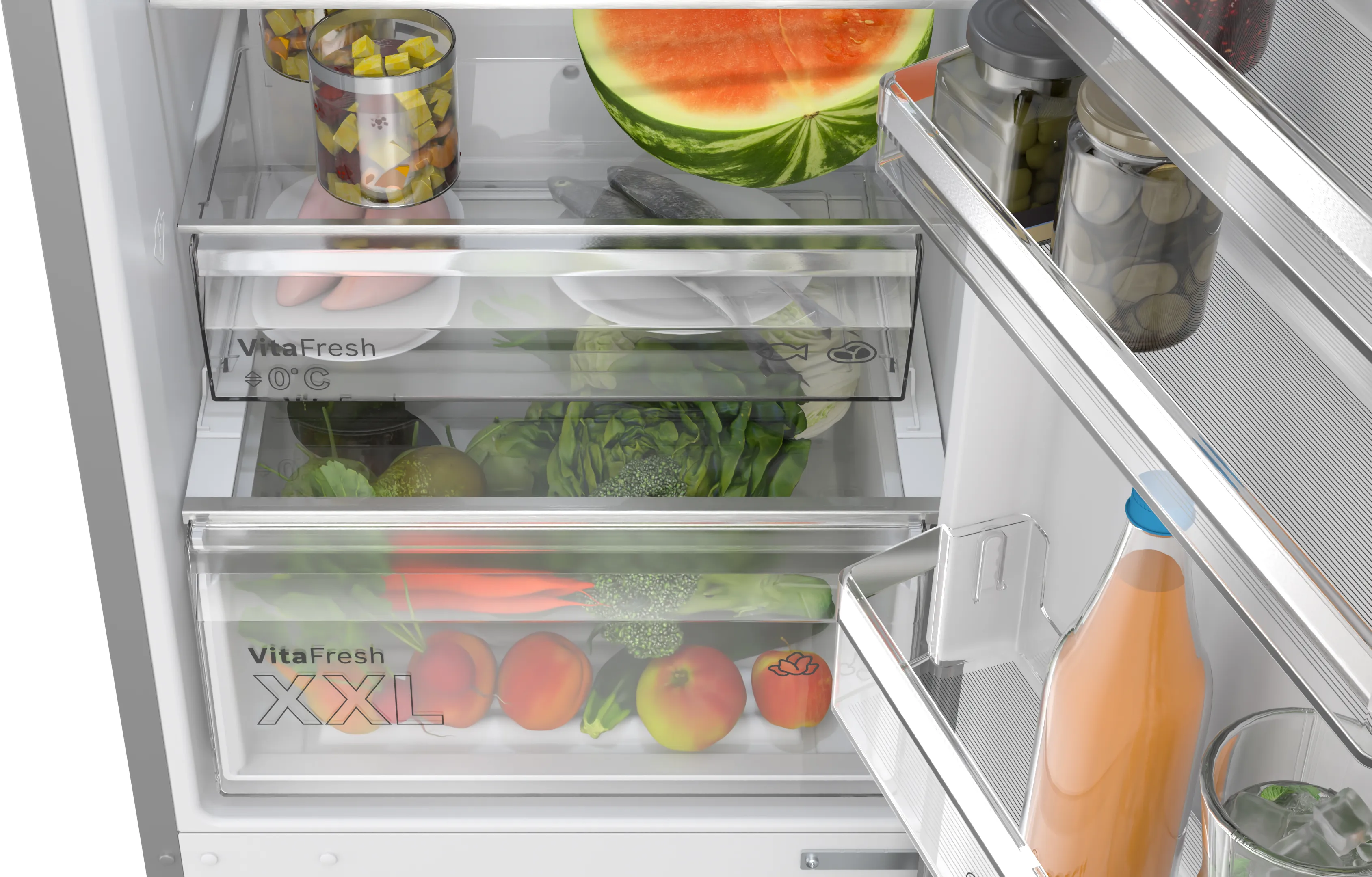 Технологія Total No Frost дарує зручність, не потребуючи розморожування, адже підтримує оптимальну вологість та температурний режим всередині. Система VitaFresh Plus дозволяє зберігати ягоди, овочі та фрукти свіжими довше завдяки точному контролю температури та вологості.