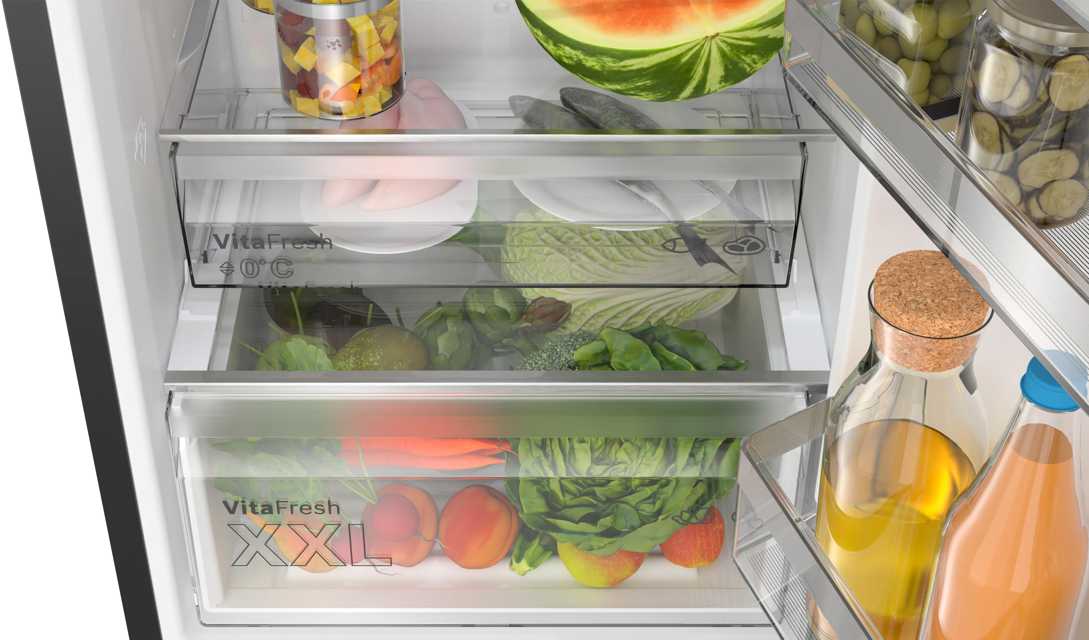 Модель Bosch KGN39EXCF оснащена технологією Total No Frost, яка запобігає утворенню інею, що дозволяє уникнути ручного розморожування, а також забезпечує постійну циркуляцію повітря, що суттєво підвищує збереженість продуктів. Об’єм холодильного відділення складає 260 літрів, а морозильного – 103 літри, що забезпечує достатньо місця для продуктів на будь-який випадок.