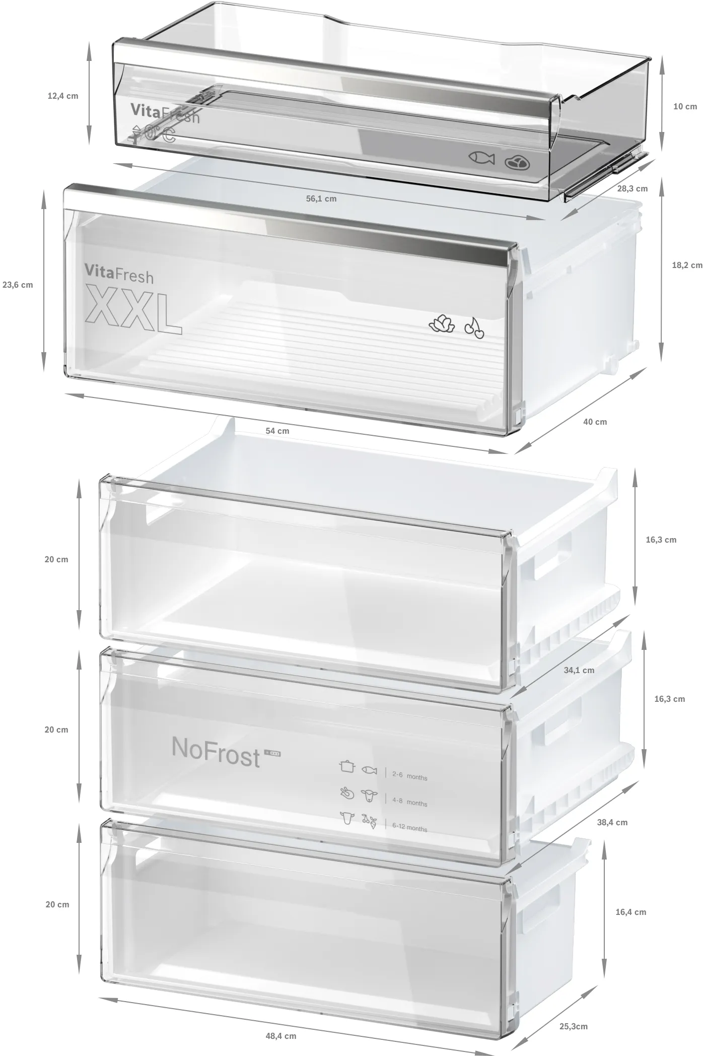 Однією з ключових функцій даної моделі є Total No Frost, що означає відсутність необхідності розморожування, завдяки чому ви можете економити свій час. Система VitaFresh підтримує оптимальні умови зберігання продуктів, що подовжує їх свіжість та якість.