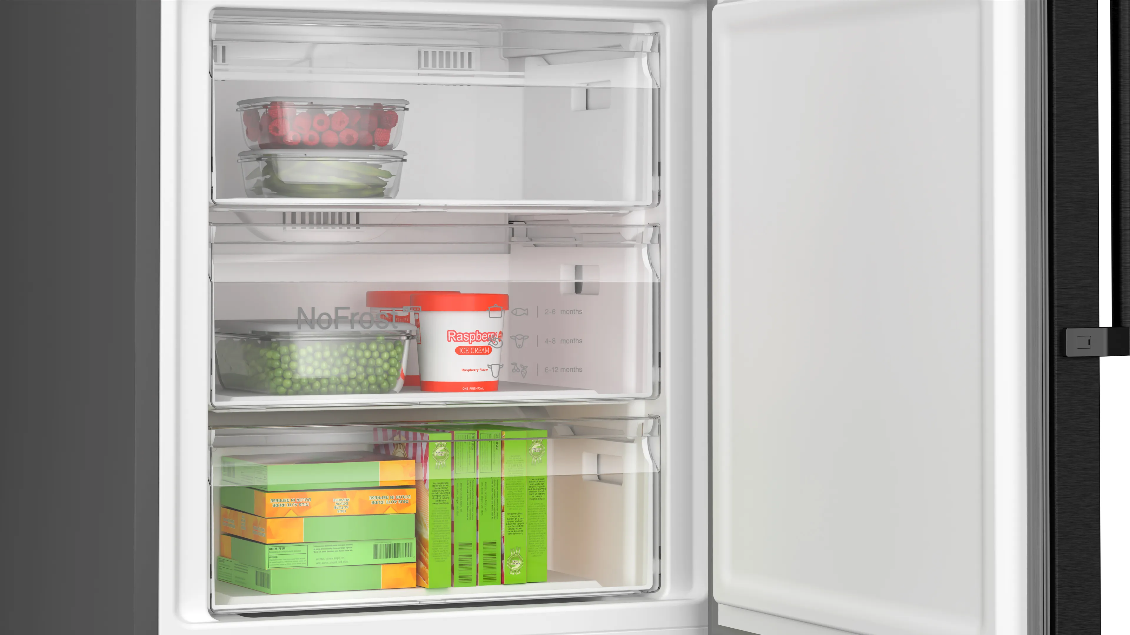 Холодильник Bosch KGN49VXCT — це поєднання сучасних технологій і стильного дизайну. Він виготовлений у матовому чорному кольорі з покриттям AntiFingerprint, що запобігає появі відбитків пальців на поверхні. Завдяки Тotal No Frost ви забудете про ручне розморожування, адже цей холодильник підтримує оптимальний рівень вологості та температури, забезпечуючи тривале зберігання продуктів. Автоматичне відтавання робить експлуатацію пристрою ще зручнішою.