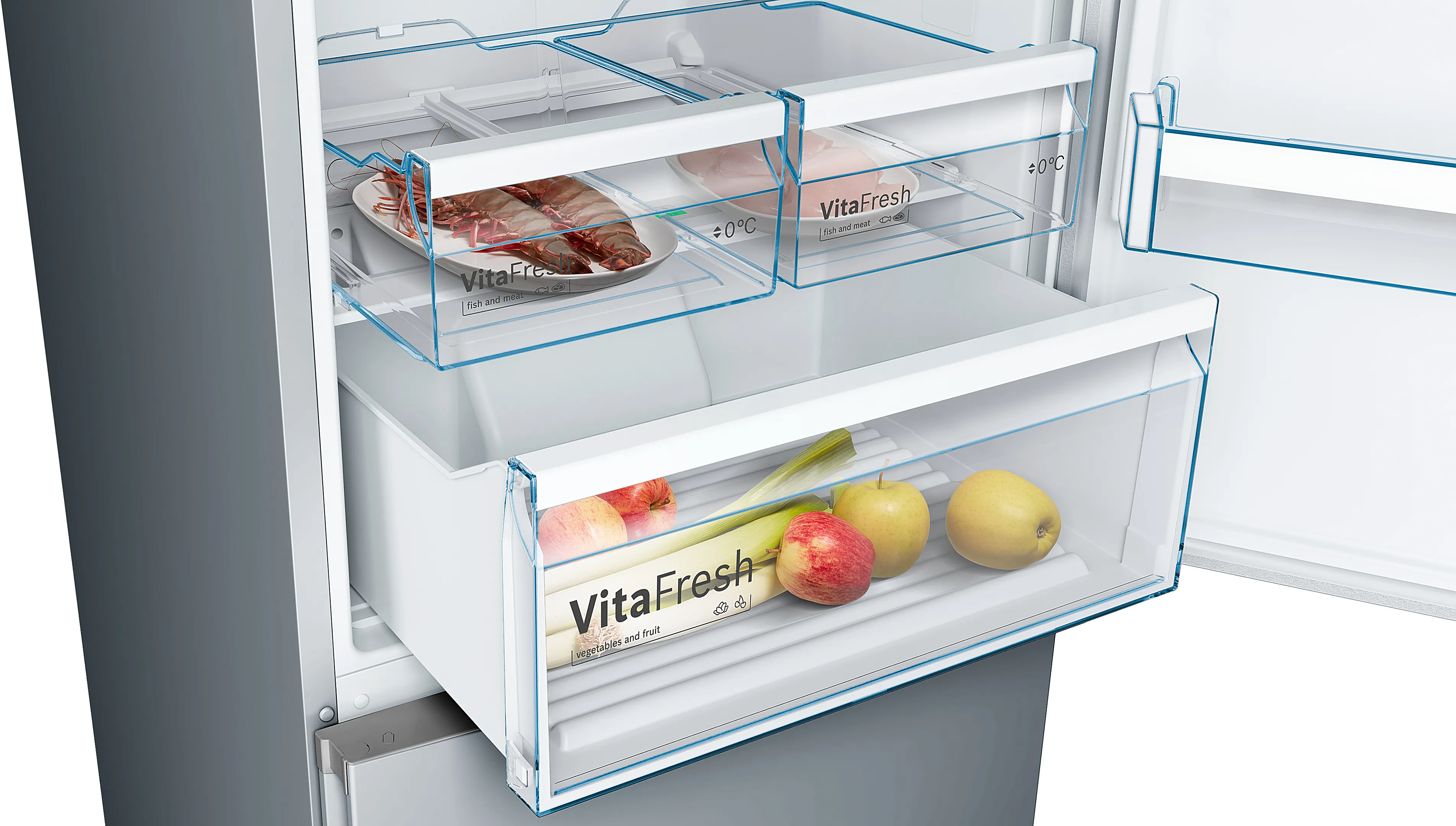 Основною перевагою цього холодильника є система підтримання свіжості VitaFresh, яка дозволяє зберігати продукти максимально свіжими протягом тривалого часу. Це особливо важливо для збереження спецій і фруктів.