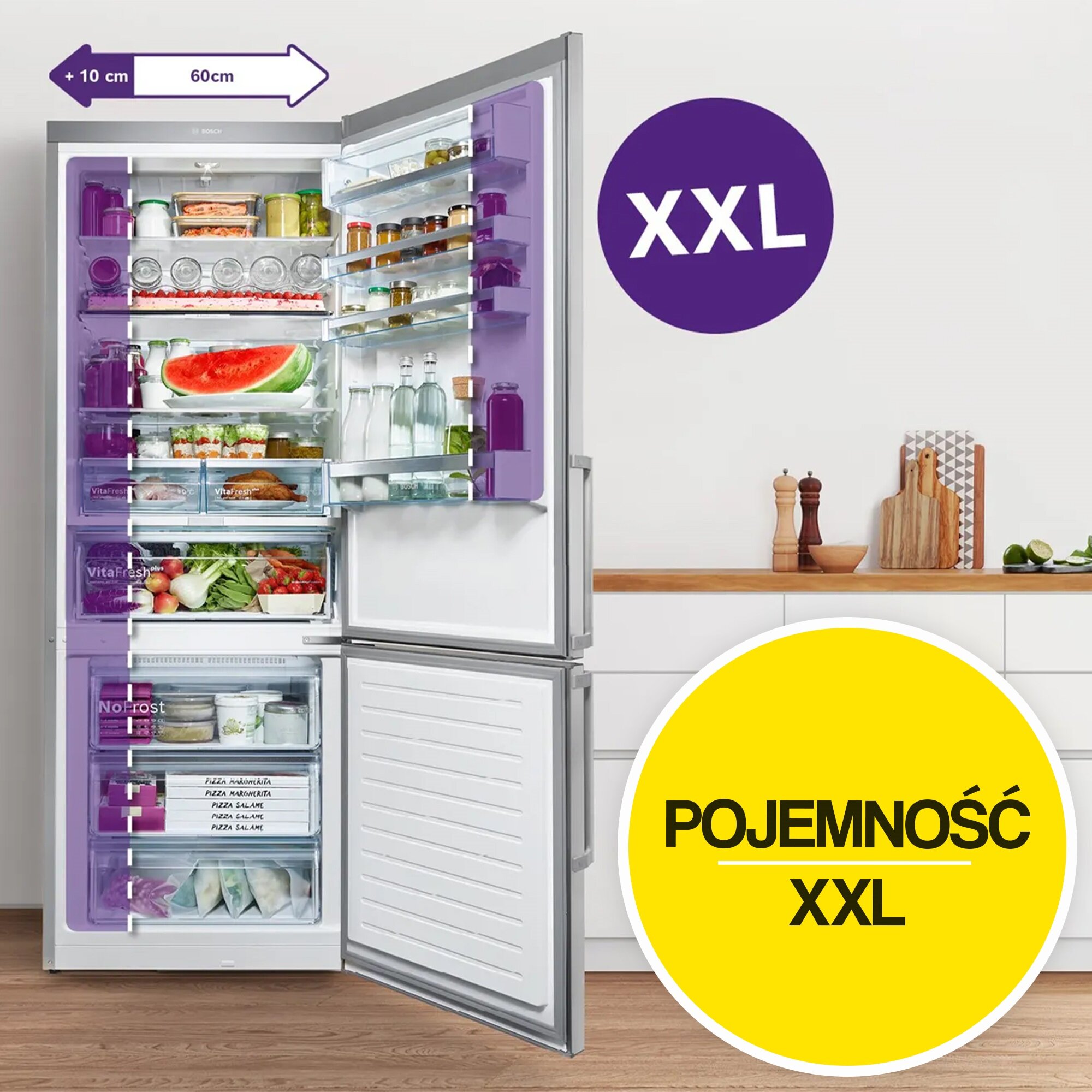 Представляємо вам холодильник BOSCH KGN86AIDR — стильний і потужний прилад, що поєднує в собі сучасні технології та високу енергоефективність. Його розміри складають 186 x 86 x 81 см, а загальна ємність досягає 631 літра, з яких 479 літрів призначені для охолодження, а 152 літра — для заморожування.