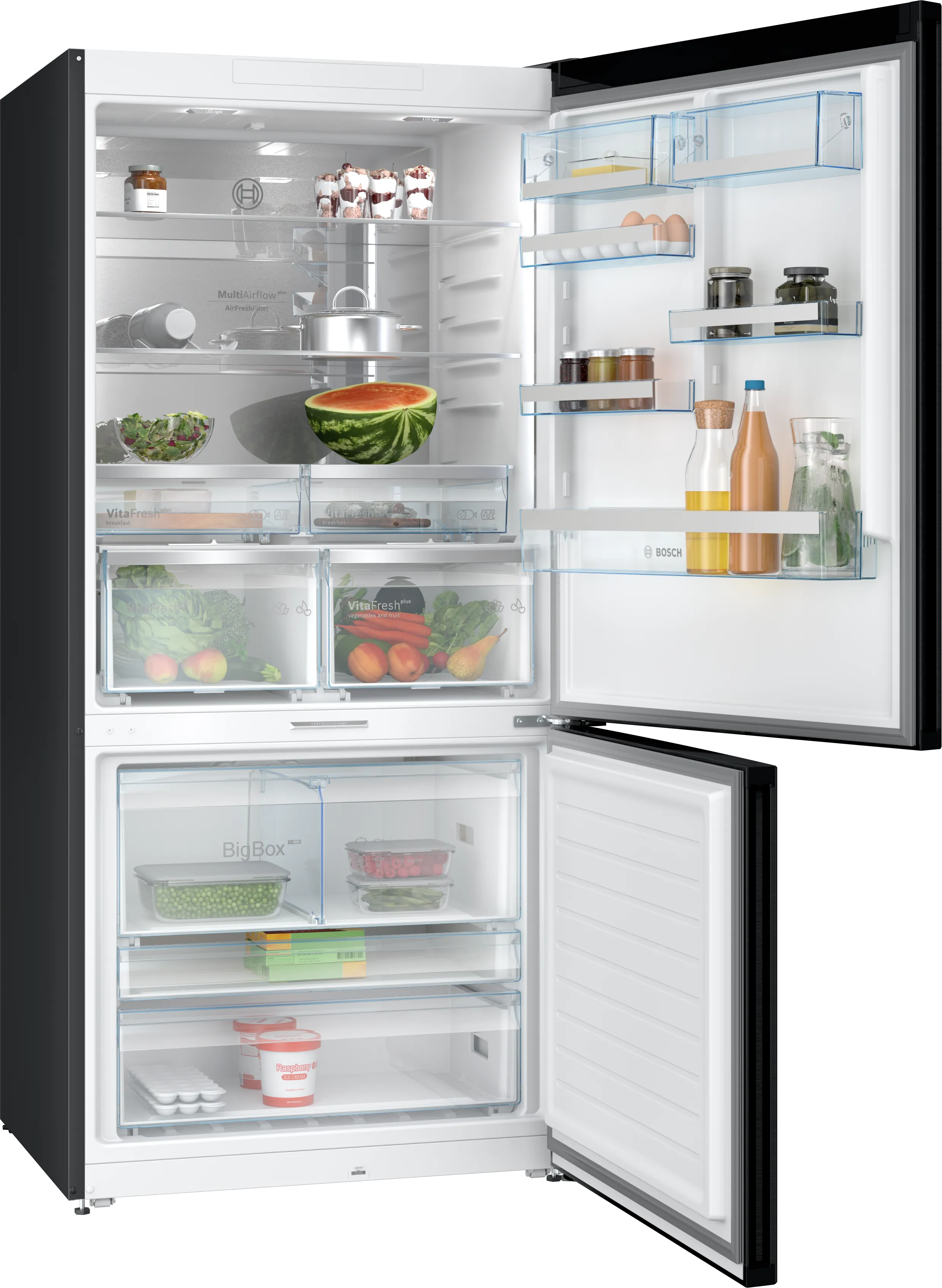 Однією з головних переваг є система VitaFresh Plus, яка дозволяє зберігати овочі та фрукти свіжими значно довше завдяки оптимальній вологості. Home Connect дозволяє контролювати холодильник дистанційно через смартфон, що робить його ще зручнішим у використанні.