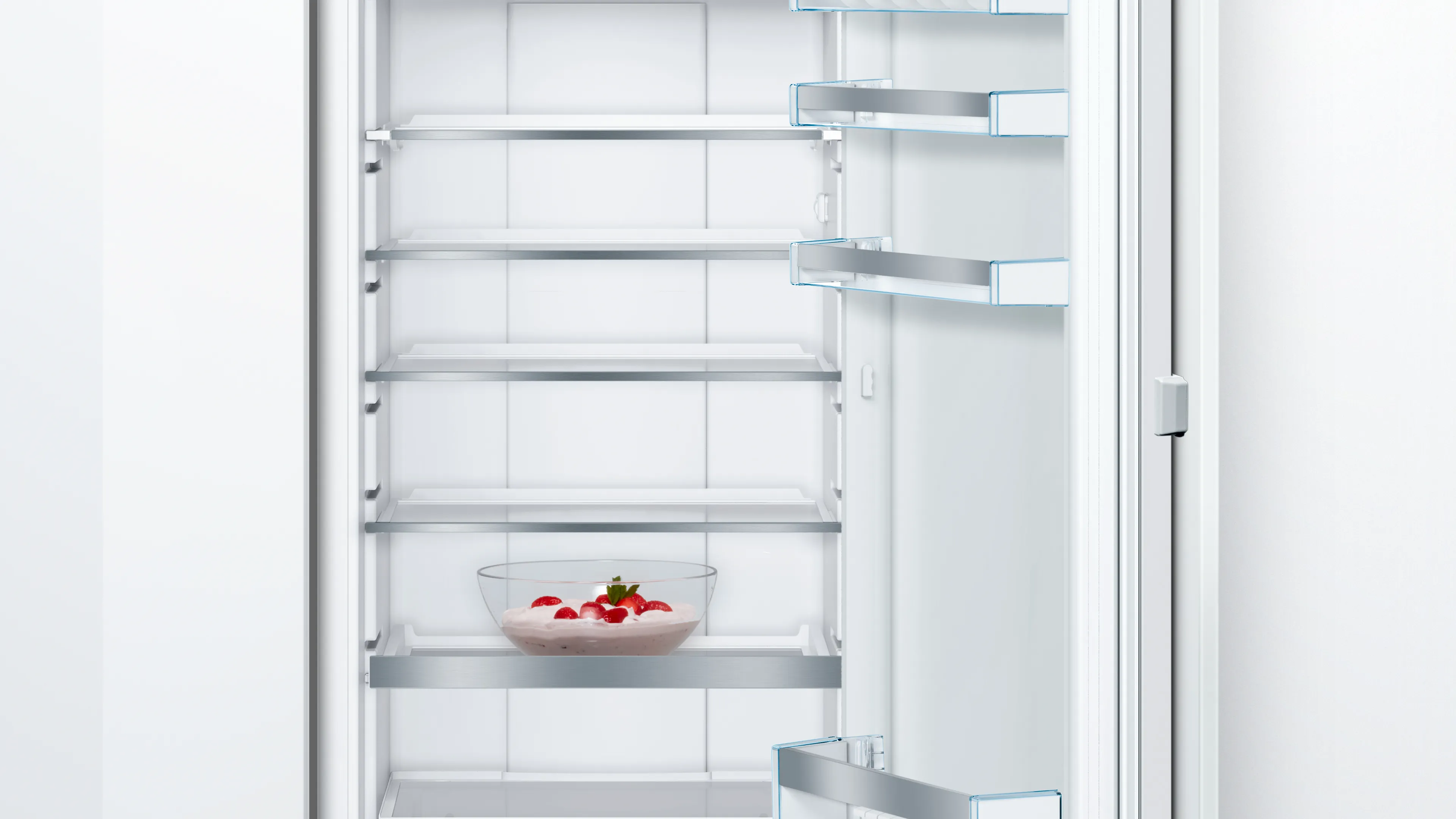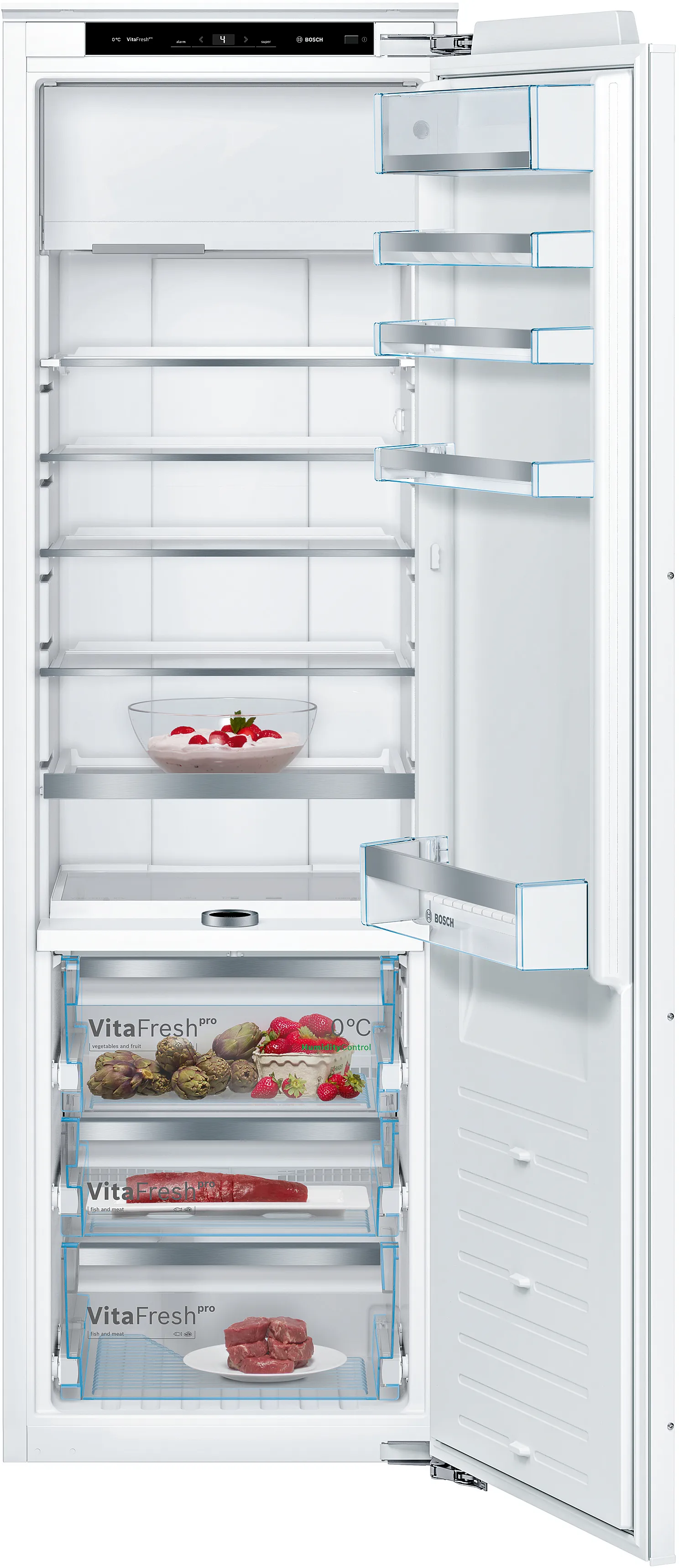 Крім того, Bosch KIF82PFE0 підтримує взаємозв'язок з домашніми пристроями через Home Connect, що дозволяє вам управляти ним через смартфон, отримуючи доступ до корисних оновлень та функцій. Ця модель має зручний правосторонній дверний механізм з можливістю зміни сторони, а також включає в себе існуючі аксесуари на кшталт ємності для льоду та тримача для пляшок.