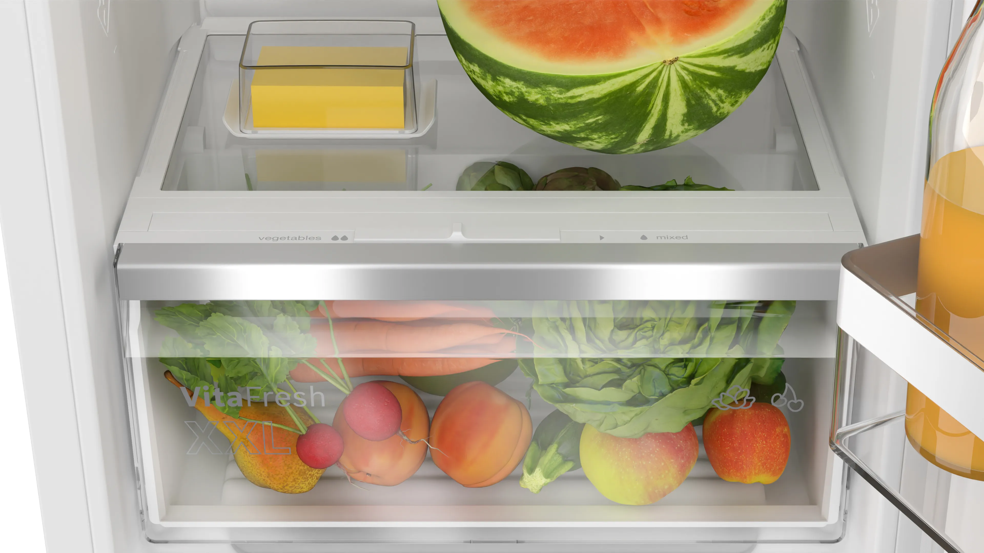 Об’єм холодильного відділу становить 165 літрів, що забезпечує достатньо місця для зберігання продуктів. Ця модель має систему VitaFresh, яка допомагає зберігати свіжість фруктів і овочів протягом тривалого часу. Холодильник працює тихо, з шумом всього 27 дБ, що дозволяє йому мати клас ефективності шуму A.