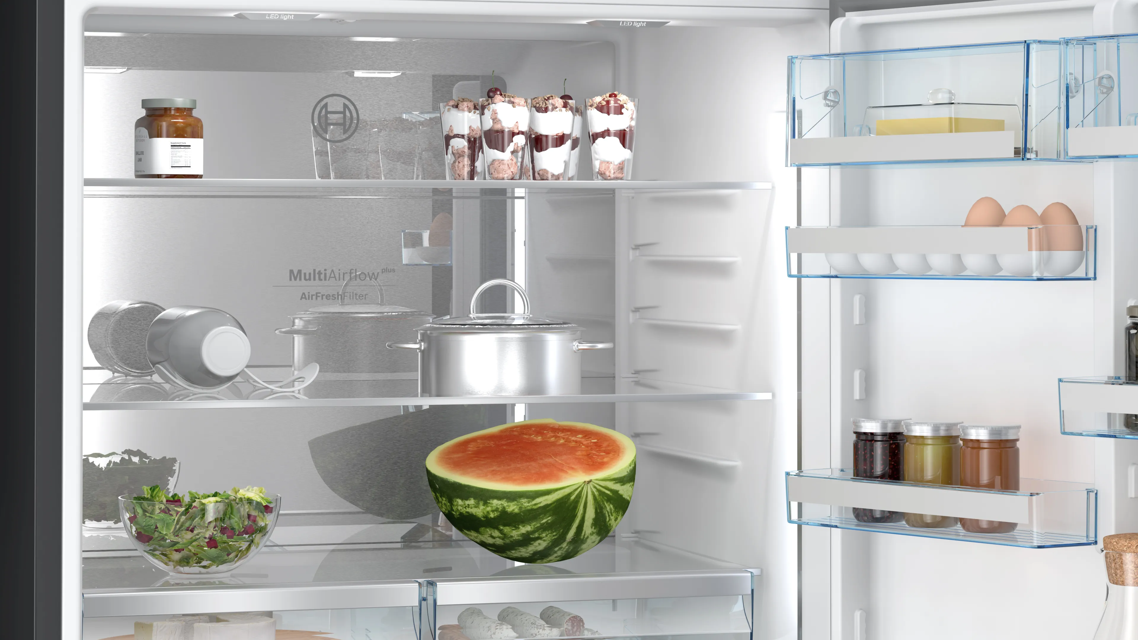 Для оптимального зберігання продуктів, холодильник обладнаний системою VitaFresh Plus, яка підтримує ідеальну вологість та температуру. Модель також має функцію Total No Frost, що усуває необхідність ручного розморожування, заощаджуючи ваш час та зусилля. У холодильнику передбачені спеціальні зони для свіжих продуктів, а також велика коробка VitaFresh для овочів та фруктів.