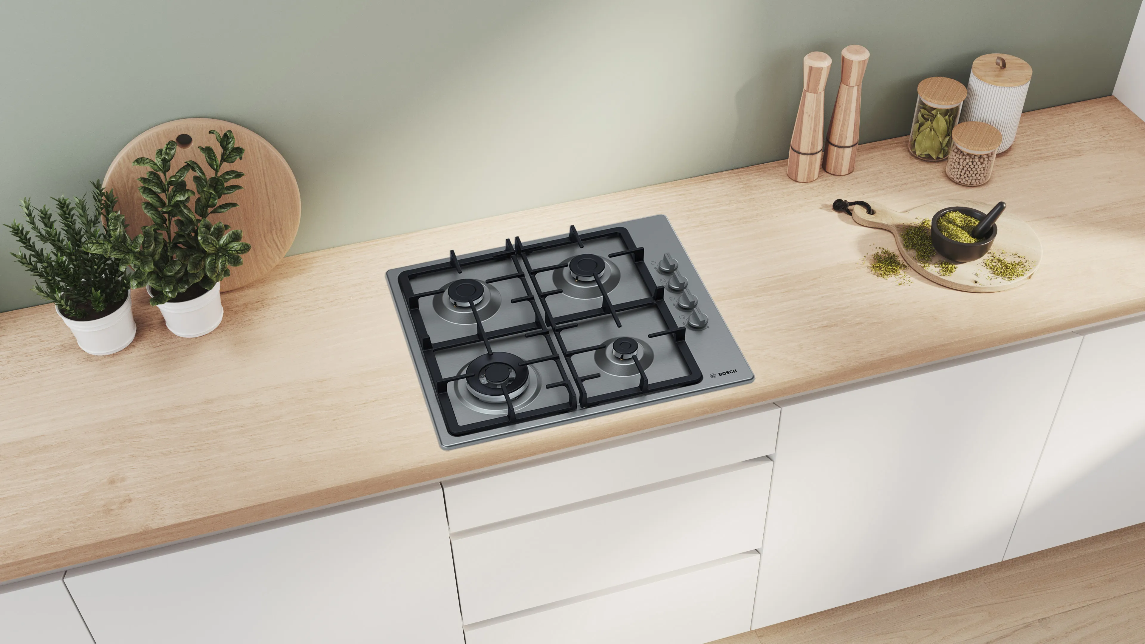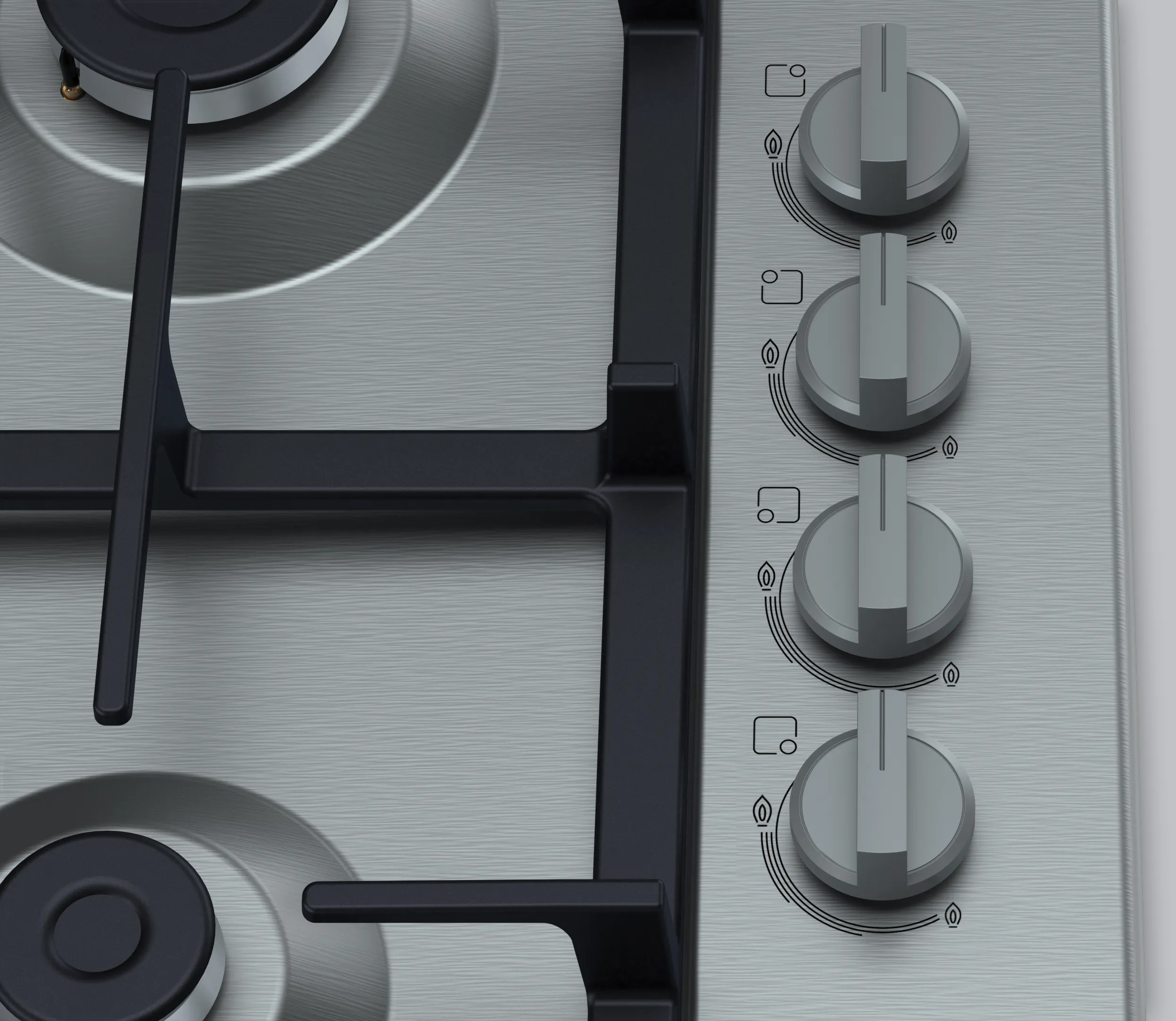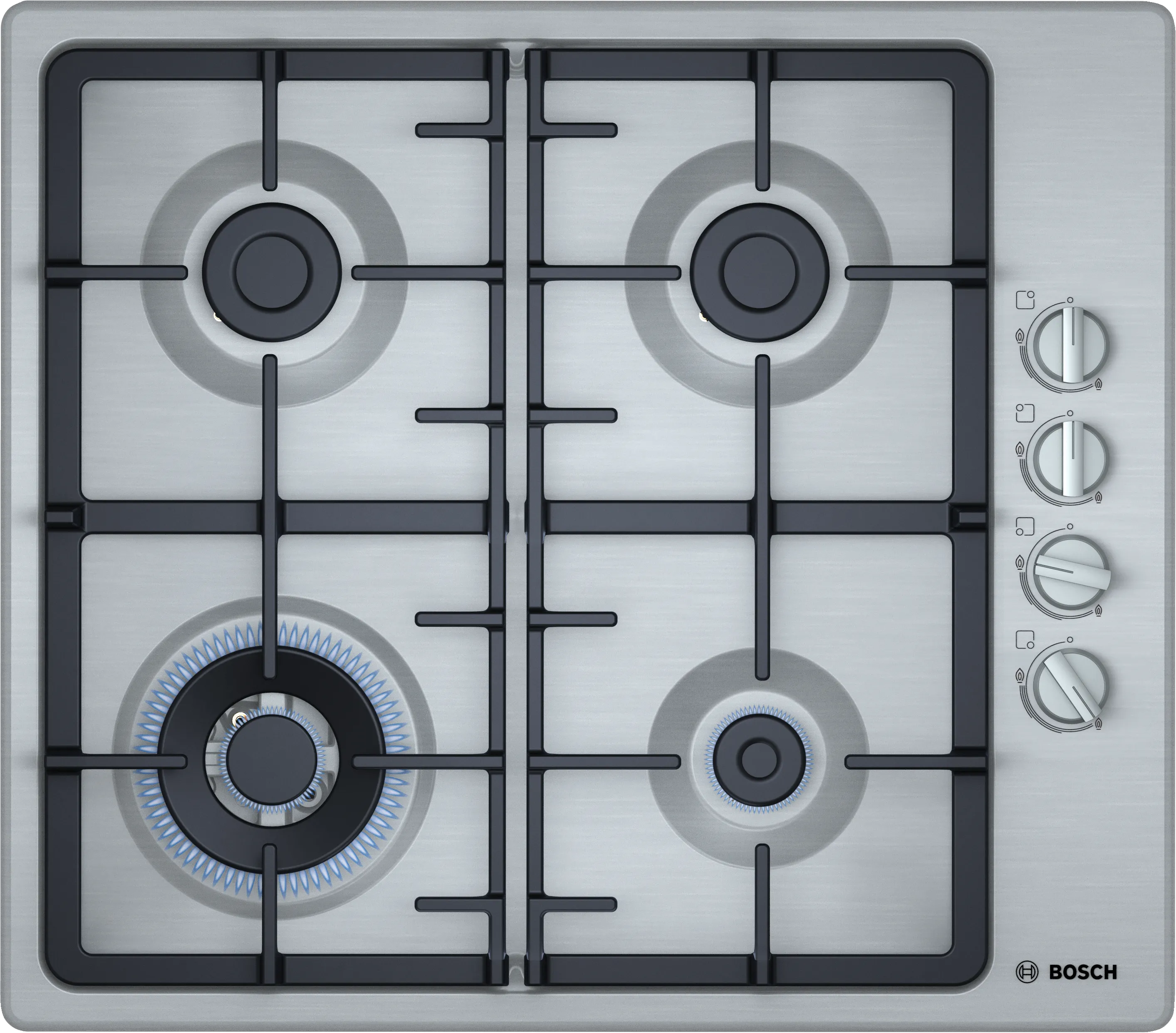 Bosch PBH6C5B92R - це газова варильна поверхня з чотирма позиціями, які можуть працювати одночасно. Вона оснащена чавунними решітками з гумовими ніжками та має 9-ступіневе регулювання полум'я. Матеріал поверхні - нержавіюча сталь. Ця варильна поверхня має габарити 54x580x510 мм та ширину 60 см.