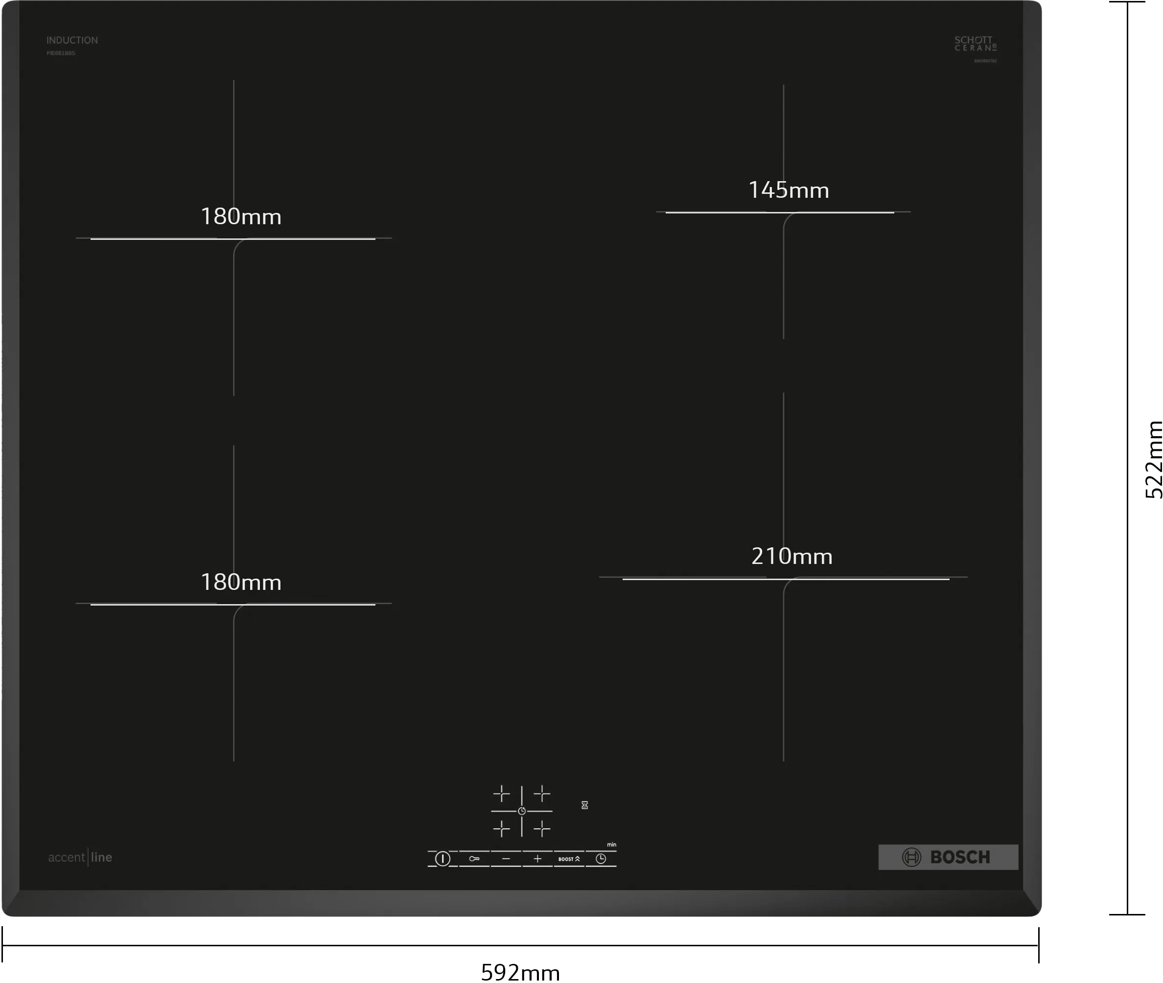 Варильна поверхня Bosch PIE631HC1M - це індукційна варильна поверхня з Direct Select управлінням, яка відрізняється своєю високою ефективністю та безпекою використання. Ця варильна поверхня має 4 зони нагріву, включаючи 2 зони діаметром 18,0 см, 1 зона діаметром 14,5 см та 1 зона діаметром 21,0 см. Її потужність коливається від 1,6 (2,2) кВт до 2,5 (3,7) кВт, що дозволяє швидко нагрівати посуд.