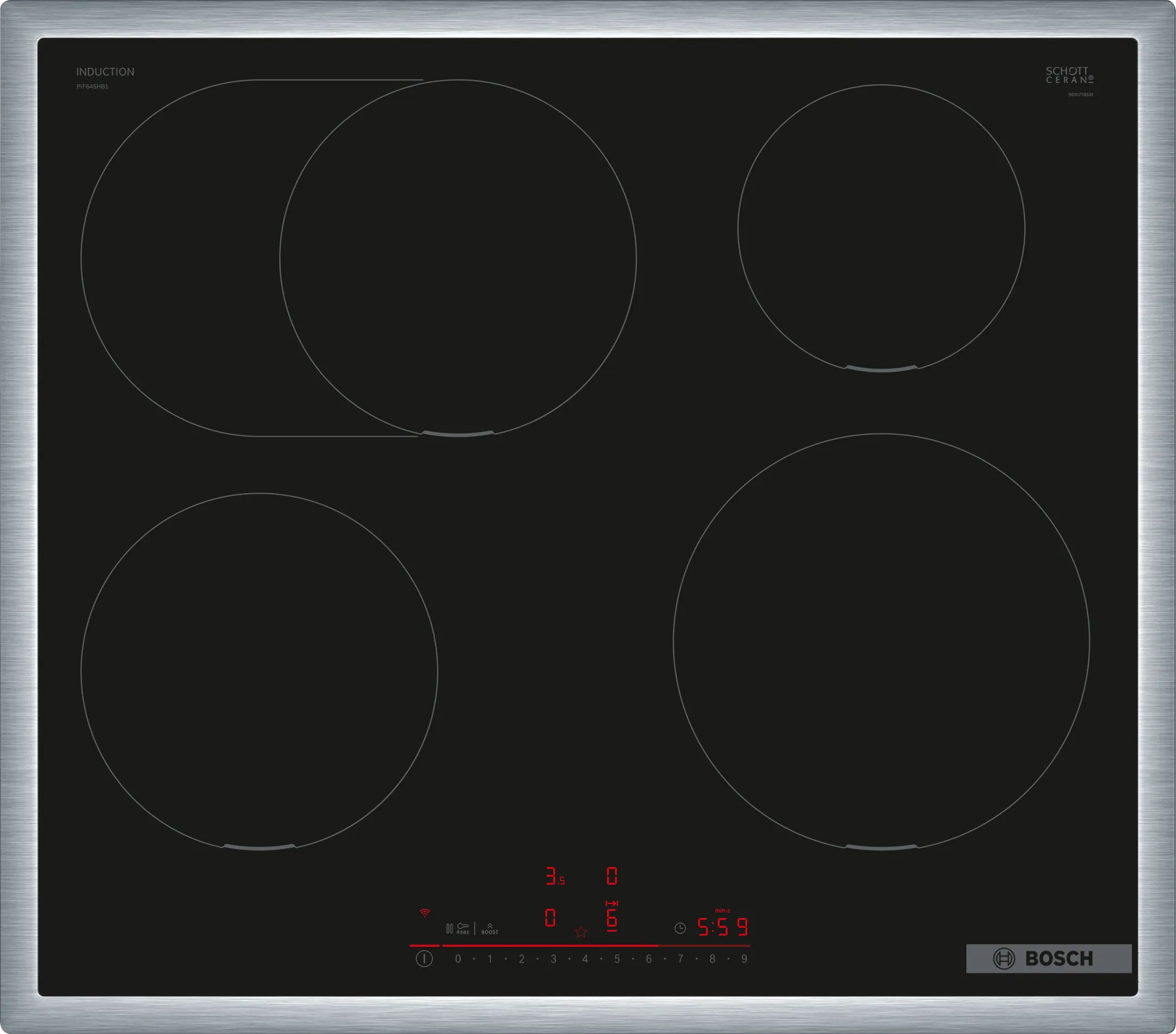 Зовнішнім виглядом варильної поверхні Bosch PIF645HB1E є сучасним і стильним завдяки чорному кольору та нержавіючій сталі, що робить її відмінним доповненням до будь-якого кухонного інтер'єру.