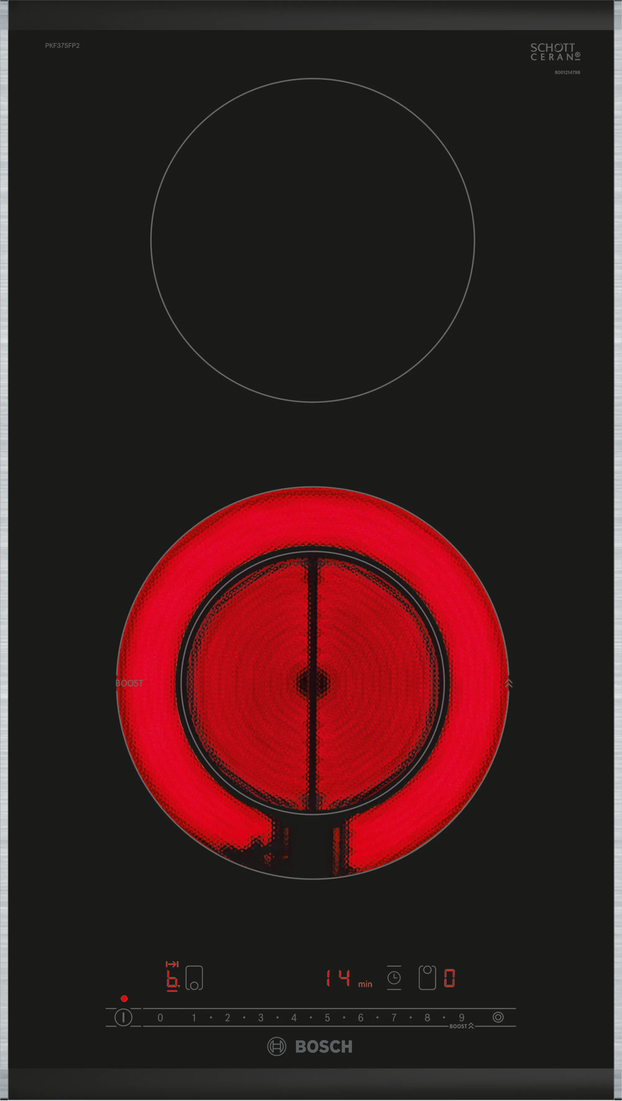 Bosch PKF375FP2E - це електрична варильна поверхня з класичним дизайном та скляною керамічною поверхнею, що забезпечує надійність та легкість у догляді. Вона має два нагрівальні елементи різного розміру - один діаметром 18,0 см з потужністю 1,2 кВт, інший діаметром 14,5 см з потужністю 2,0 (2,3) кВт.