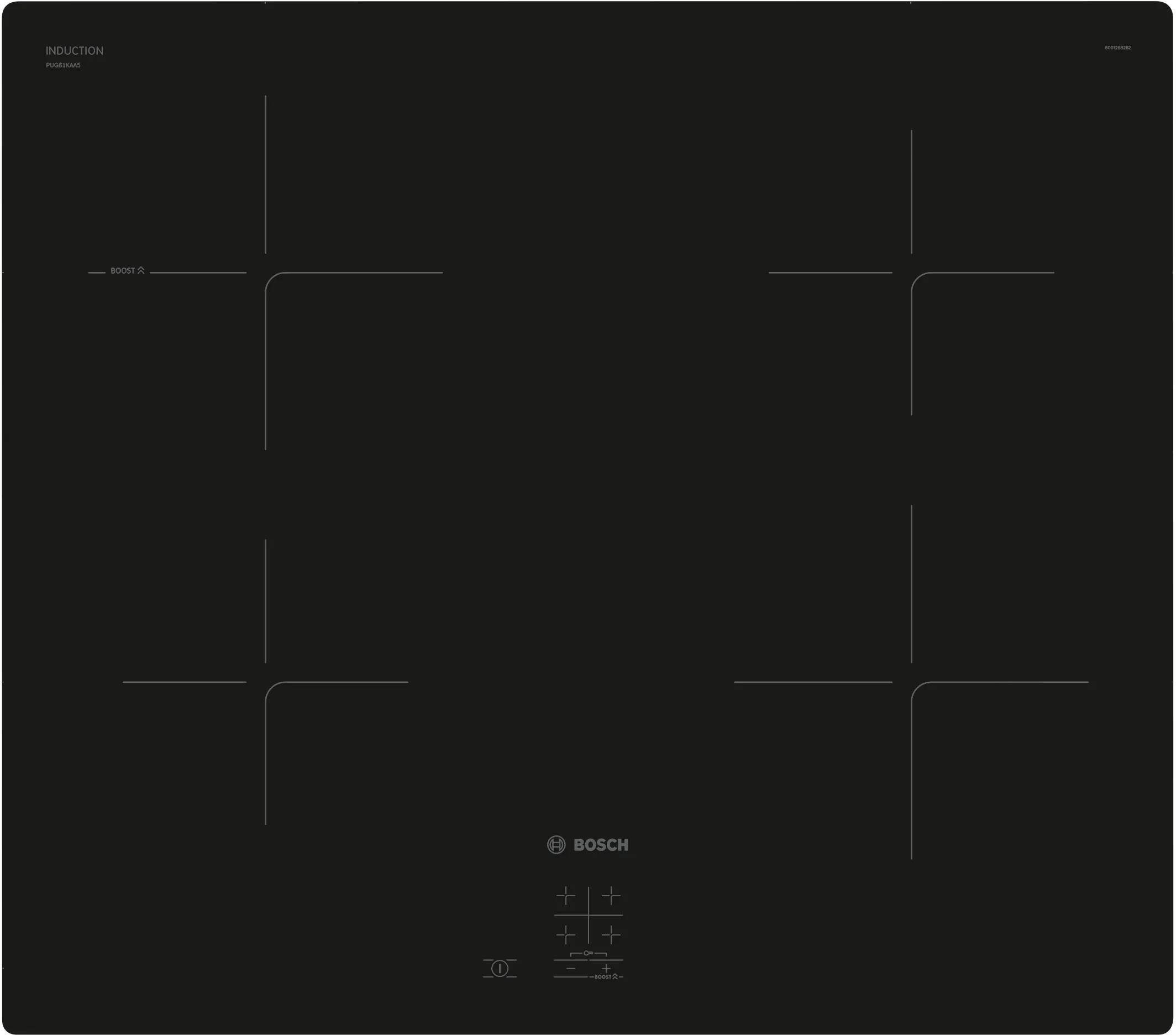 Bosch PUG61KAA5E - вбудовувана індукційна варильна поверхня з технологією нагрівання з прискоренням (буст). Має чорний колір та безрамковий дизайн. Розміри складають 51x592x522 мм, ширина - 60 см. Мінімальні розміри для вбудовування - 51 x 560-560 x 490-500 мм. Мінімальна товщина робочої поверхні - 16 мм. Загальна потужність - 4600 Вт, довжина кабелю електроживлення - 110 см. Кількість позицій, що можуть працювати одночасно - 4.