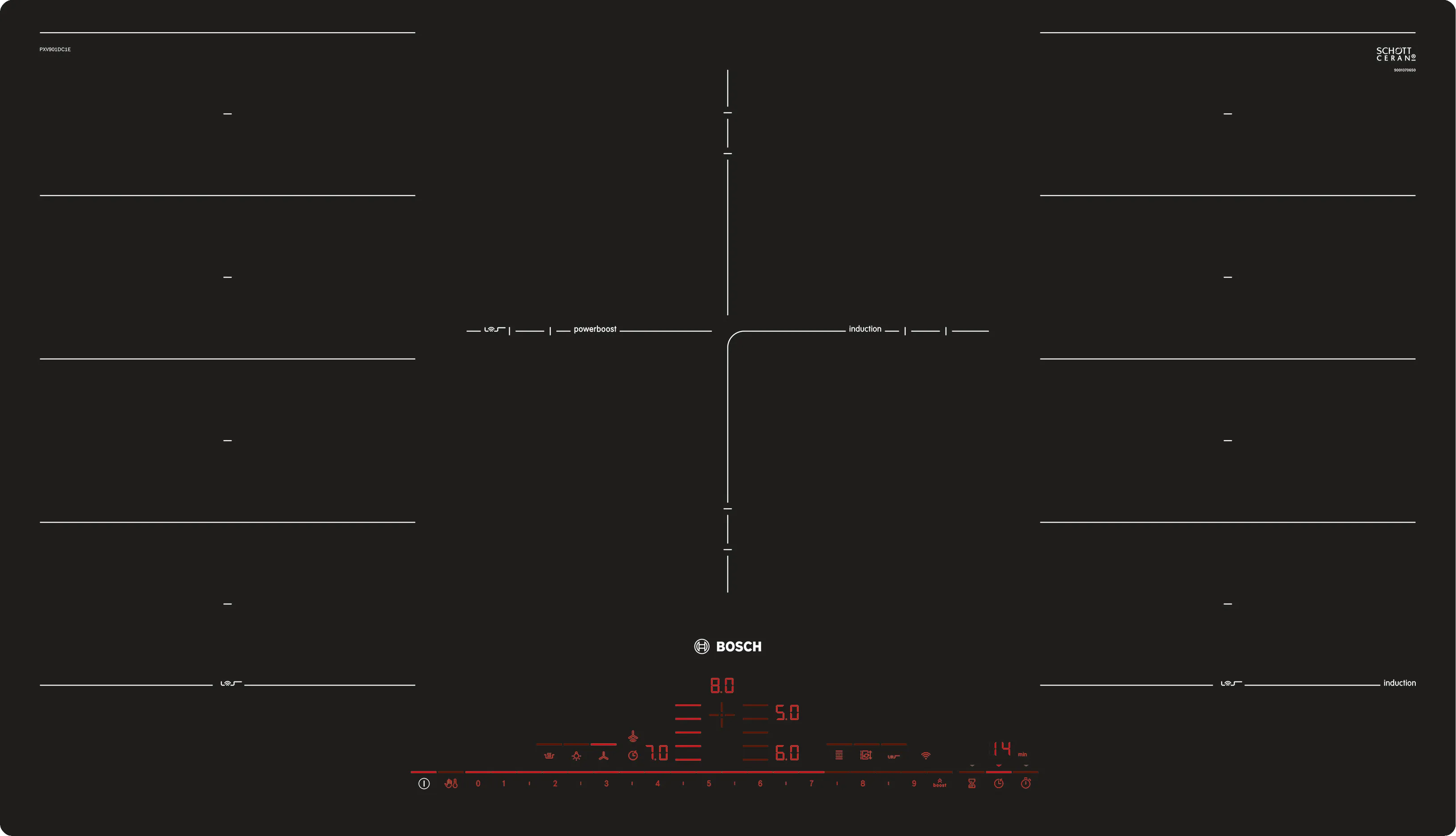 Варильна поверхня Bosch PXV901DV1E - це індукційна варильна поверхня з 5 зонами для приготування страв. Основні характеристики цієї моделі включають DirectSelect Premium управління, яке дозволяє легко і точно вибирати потрібні налаштування. Також є функція PerfectFry Bratsensor, яка запобігає підгоранню їжі. Ця варильна поверхня має 2 гнучкі зони для посуду різної форми та трикругову зону, що робить приготування страв більш зручним. Вбудований дизайн з флеш-панелью дозволяє інтегрувати цю варильну поверхню ідеально у кухонний інтер'єр. Щодо розмірів, ширина варильної поверхні становить 90 см, а висота лише 56 мм, що дозволяє їй ідеально вписатися в будь-які кухонні розміри. Також варильна поверхня має 17 рівнів потужності та можливість підтримувати температуру. Зручність використання забезпечується наявністю функцій, які включають в себе таймер вимкнення, таймер зворотного відліку та функцію підсилення. Додатковою перевагою є можливість підключення до додатку Home Connect для керування з використанням смартфона. Безпеку користування забезпечують блокування від дітей та функція виявлення посуду. Крім того, варильна поверхня має індикатор залишкового тепла, який попереджує про можливість опіків при доторканні до зон приготування. Високотехнологічний та функціональний, Bosch PXV901DV1E стане надійним помічником у кожній кухні, забезпечуючи швидке та ефективне приготування їжі.