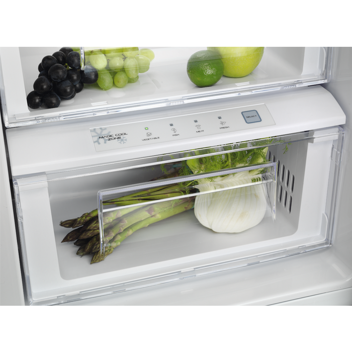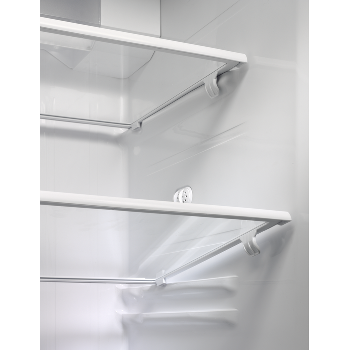 У холодильнику передбачено світлодіодне освітлення как у морозильному, так і в холодильному відділеннях, що забезпечує яскраву видимість. Полки виготовлені зі скла та мають повну ширину, що спрощує розміщення продуктів різних розмірів. Додатково є два шухляди в морозильнику, виконані з прозорого пластику, що дозволяє легко бачити вміст.