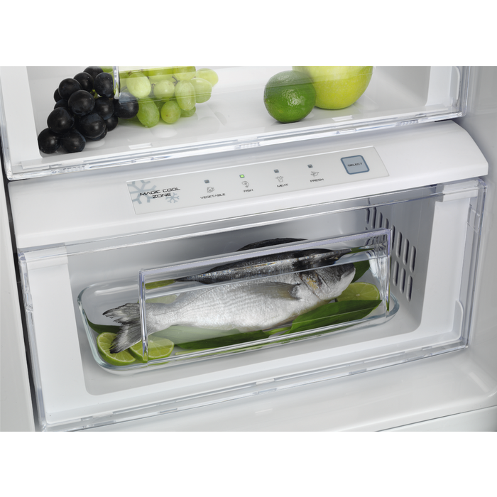Цікавим аспектом є світлодіодне освітлення в обох відділеннях, яке забезпечує яскраве і рівномірне висвітлення. Холодильник має 2 скляні полиці повної ширини в холодильному відділенні та 3 скляні полиці в морозильній камері, що дозволяє легко організувати простір. Легкі у використанні прозорі шухляди забезпечують легкий доступ до продуктів.