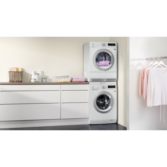 Сушильна машина має контейнер для конденсату об'ємом 5,28 л, що розташований зліва на панелі, та опцію встановлення безпосереднього дренажу. Вона легко вписується в будь-який інтер'єр, має стильний білий колір і зручні регульовані ніжки для ідеального встановлення. Обирайте Electrolux EDH3487RDE для комфортного та ефективного сушіння вашого одягу!