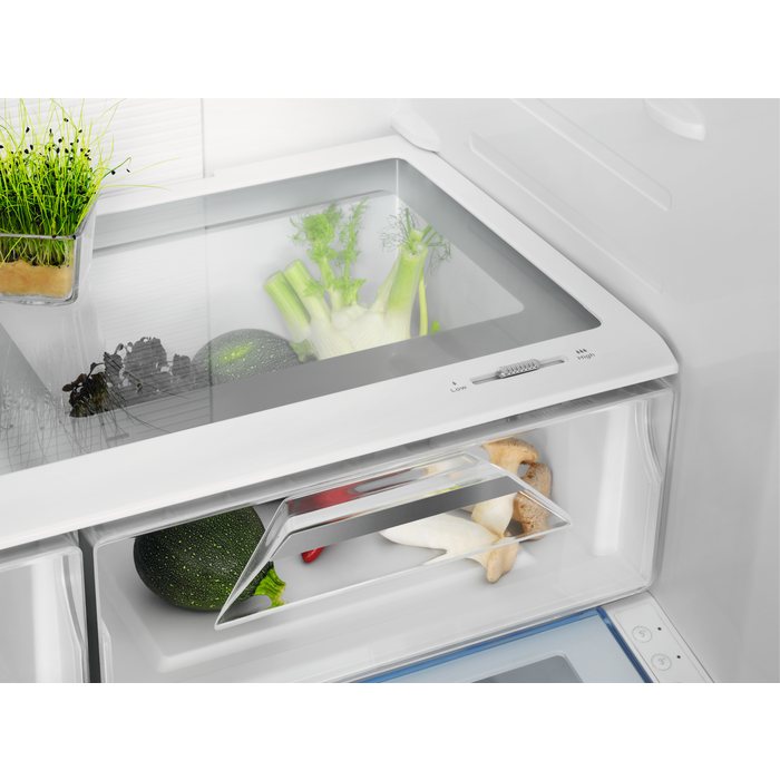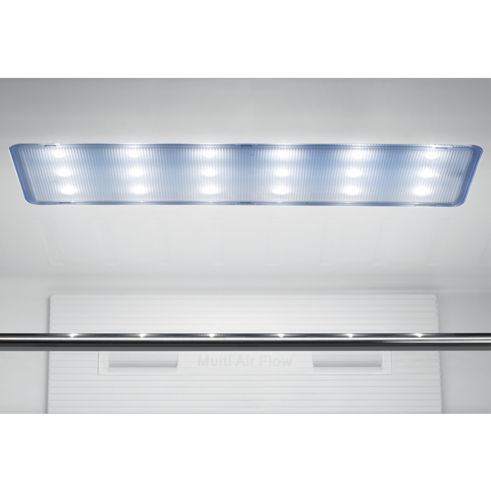 Крім того, холодильник має звуковий та візуальний сигнал про високу температуру, що гарантує безпечне зберігання продуктів. Внутрішнє світлодіодне освітлення холодильного відділу забезпечує освітленість, а полички з скла повної ширини додають елегантності.